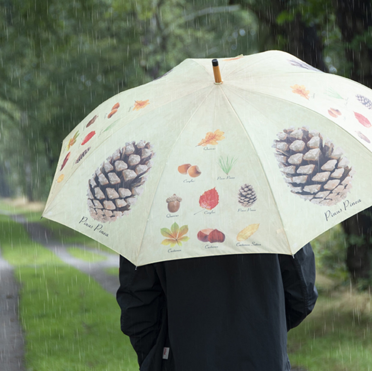 Originálny a veľký dáždnik pre každého, kto kto obdivuje ríši rastlín! Tento kúsok má na krémovom podklade, krásne zobrazenie listov a plodov hneď piatich druhov stromov, ktoré určite poznáte.