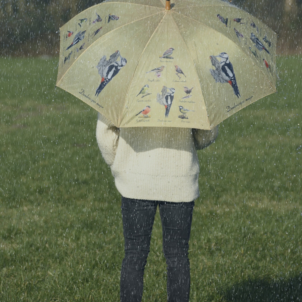 Na dáždniku nájdete rôzne veľké zobrazenie Vrabca domáceho, Červenky obyčajné, Sýkorky belasé, Pinky obyčajné, Ďateľa veľkého, Hyla obyčajného, Orieška obyčajného a Sýkorky veľká. Naviac je u každého vtáčika aj jeho latinské meno.
