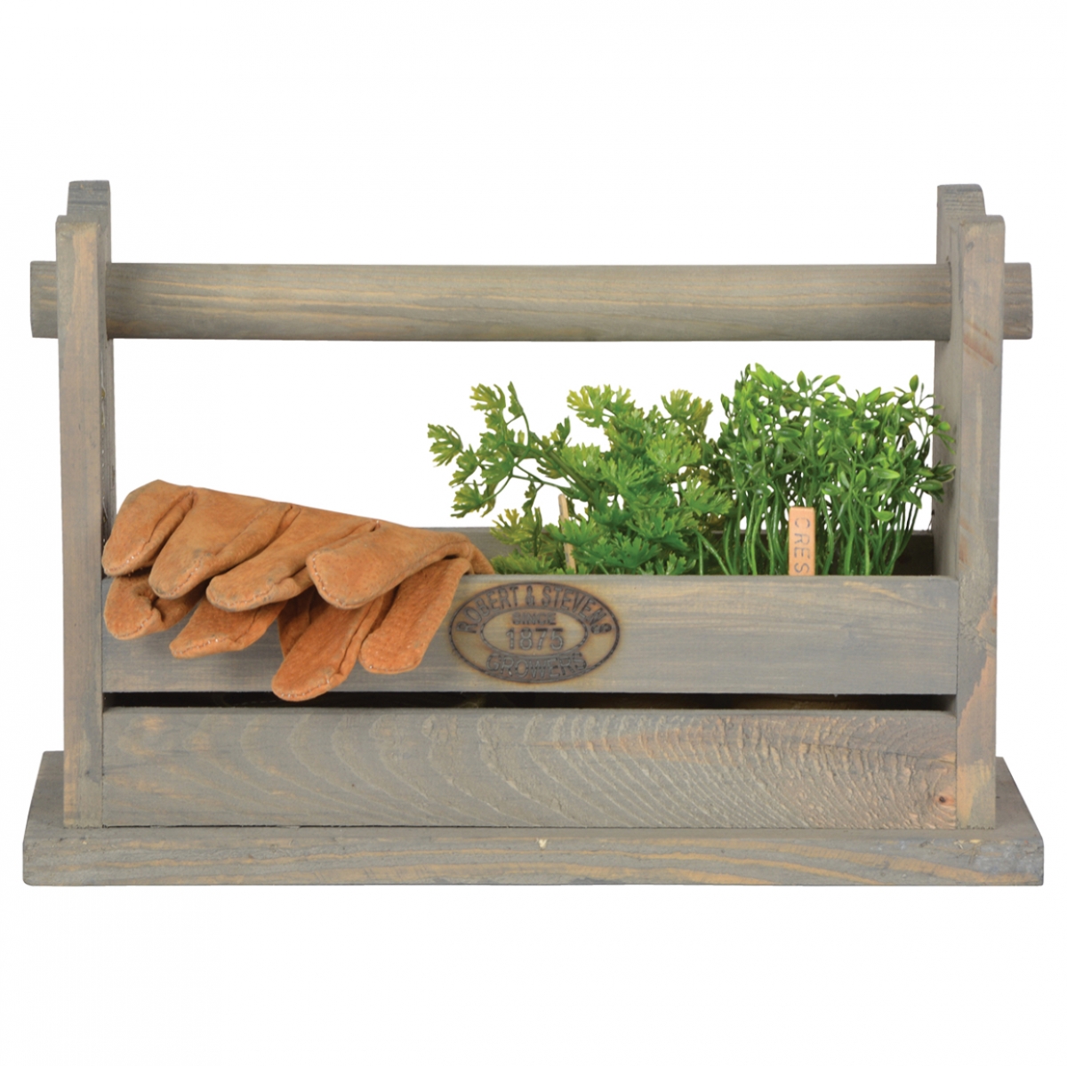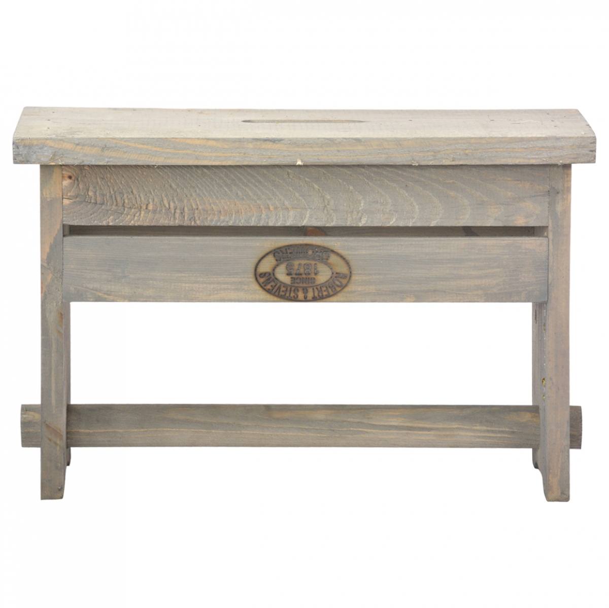 Debnička na náradie/stolička je vyrobená z dreva, ktoré je namorené šedou farbou. Nájsť na nej môžeme tiež vypálené logo, na ktorom stojí ROBERT and STEVENS, SINCE 1875, GROWERS.