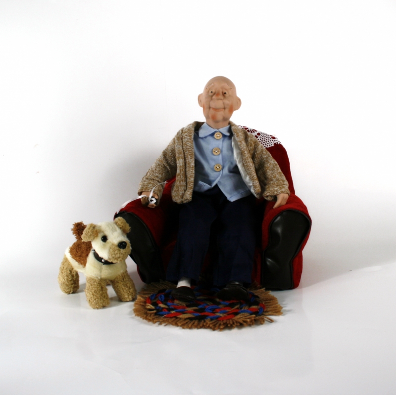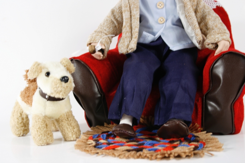 Dedko má oči chránené guľatými striebornými okuliarmi , hreje ho vlnený sveter hnedej farby zapínacie na veľké gombíky . Pod nohami leží malý guľatý koberček a na operadle kresla sa vyníma háčkovaný prehoz .