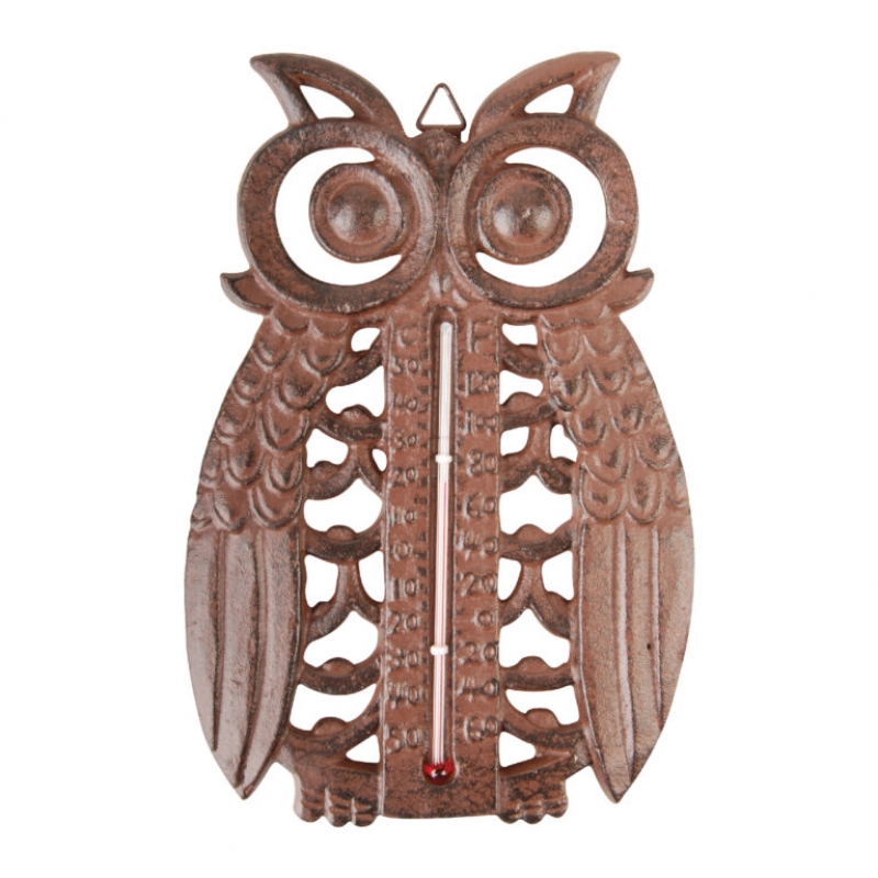 Dekorace na zeď v provedení sovy je vyřazený výrobek Teploměr sova, u kterého chybí skleněná trubička.