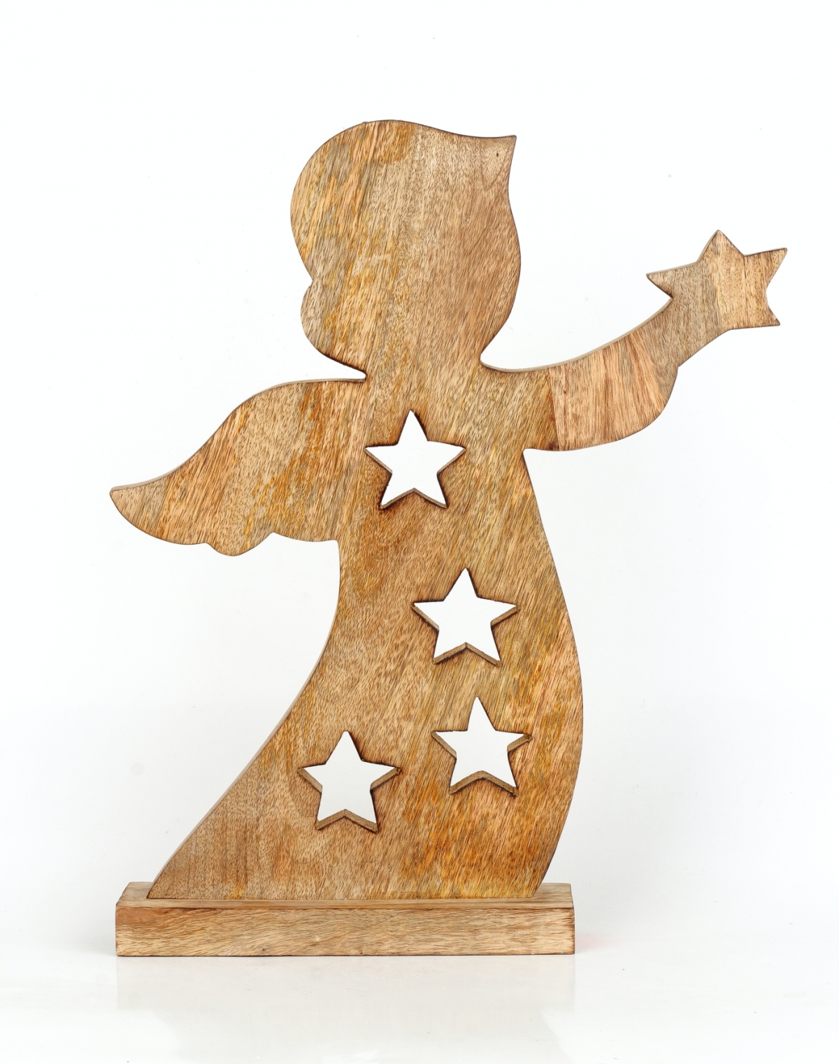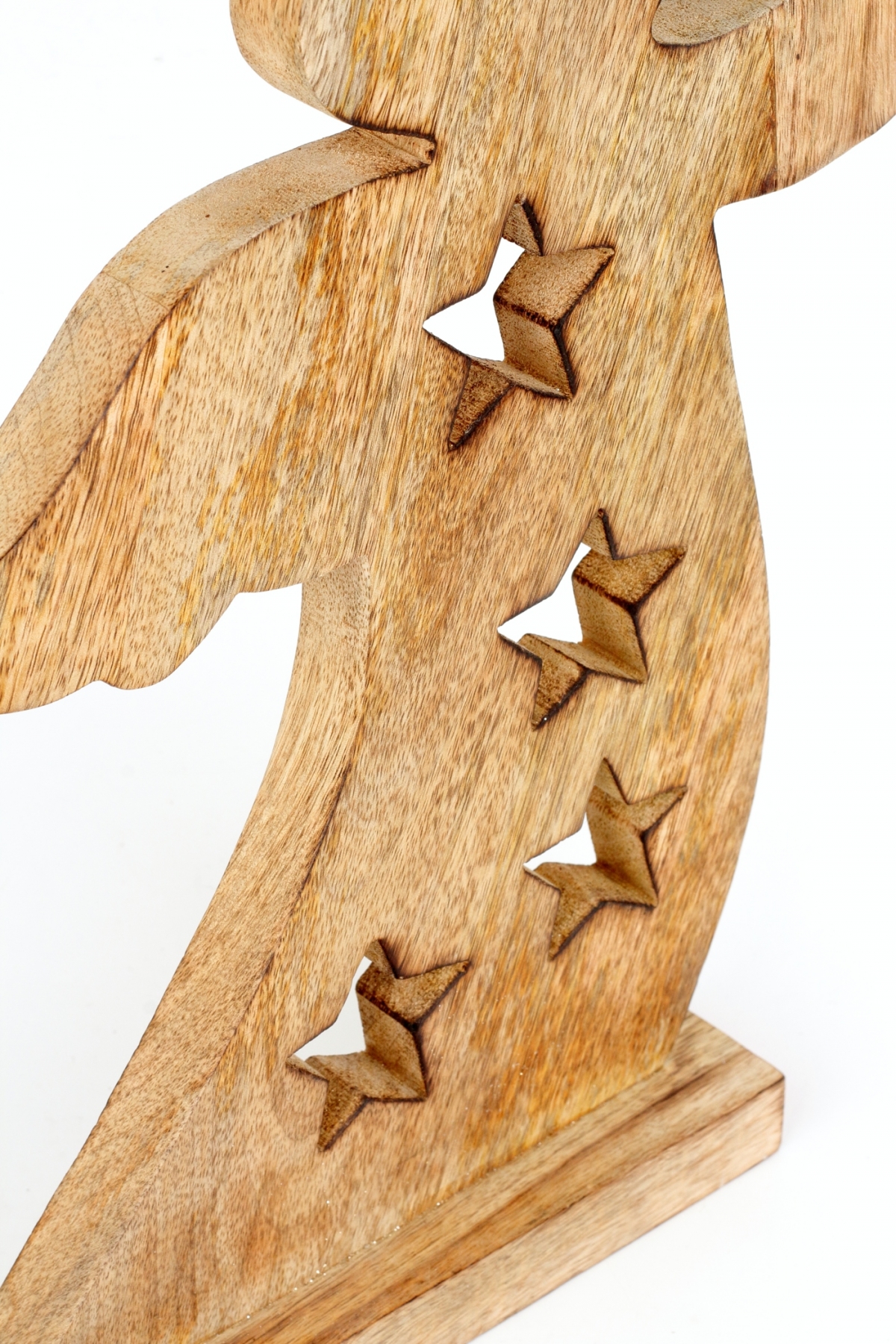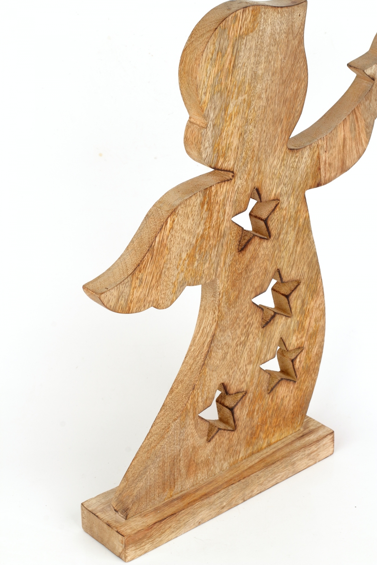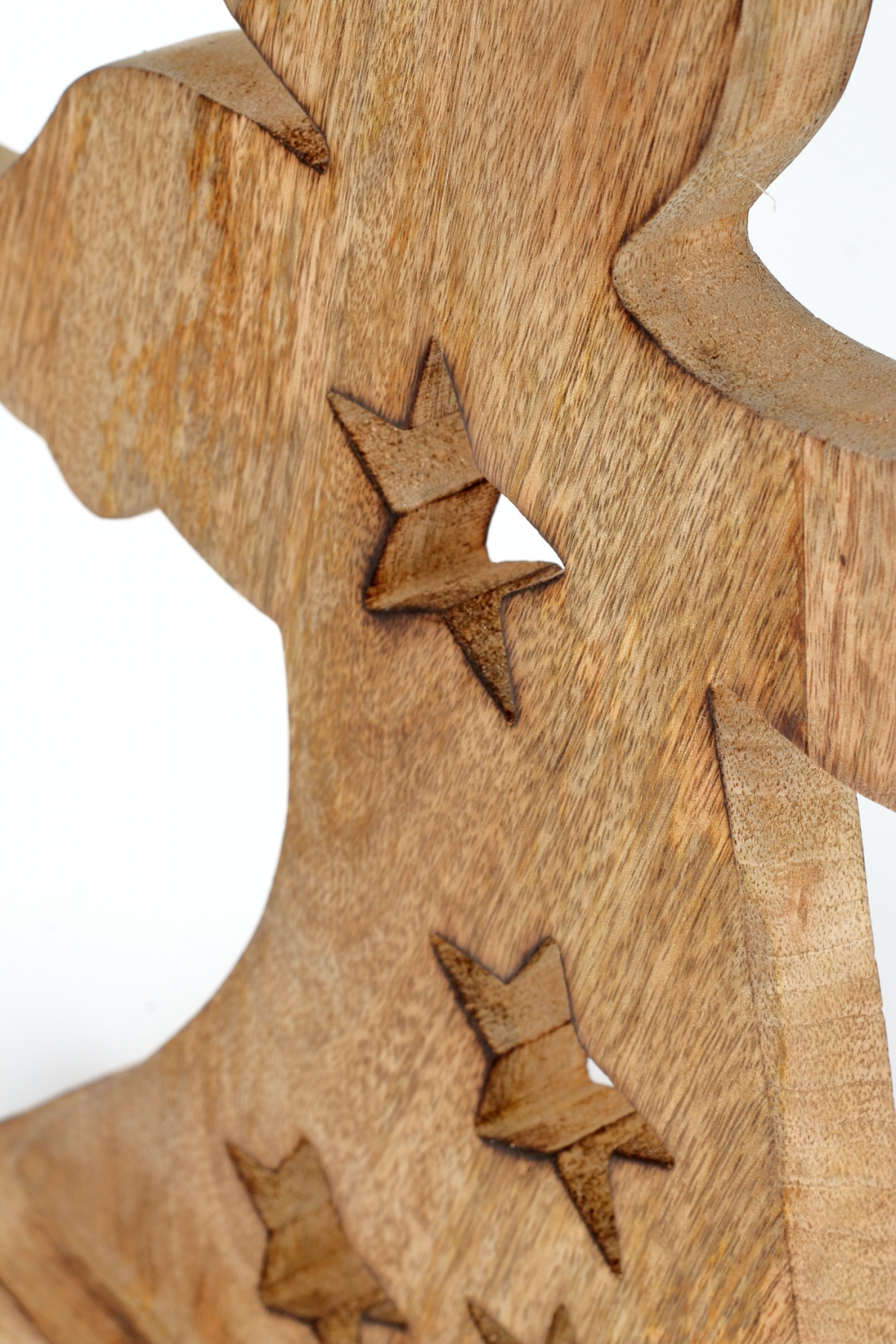 Dekorácia do bytu anjel je vyrobený z mangového dreva av materiiáli sú vyrezané otvory v tvare vianočnej hviezdy.