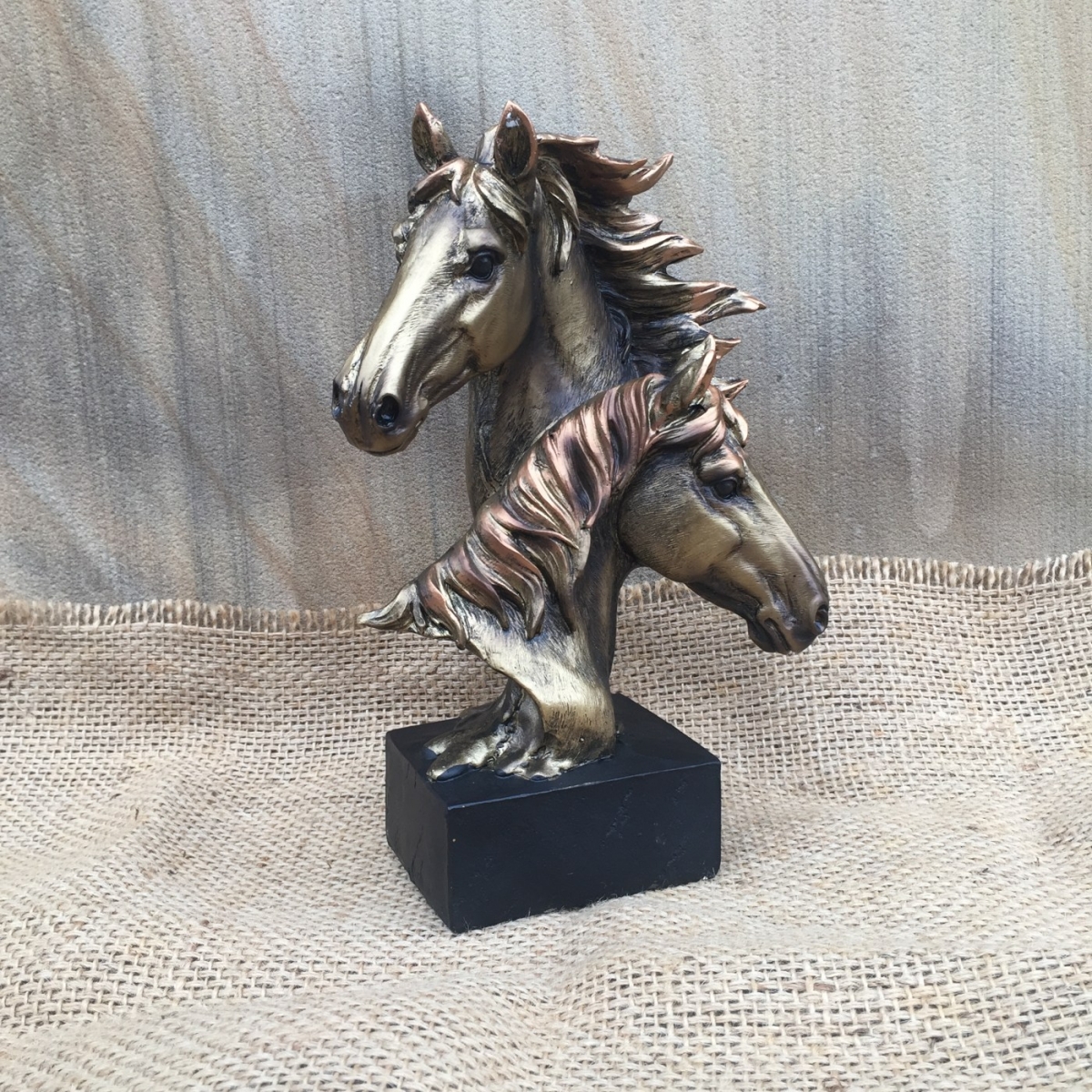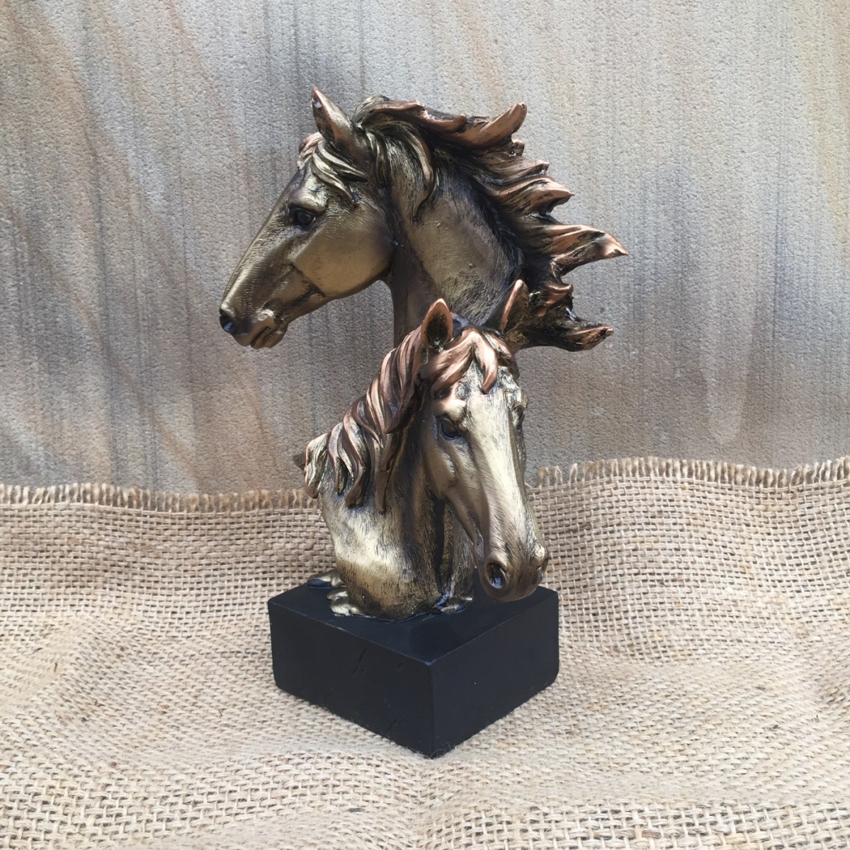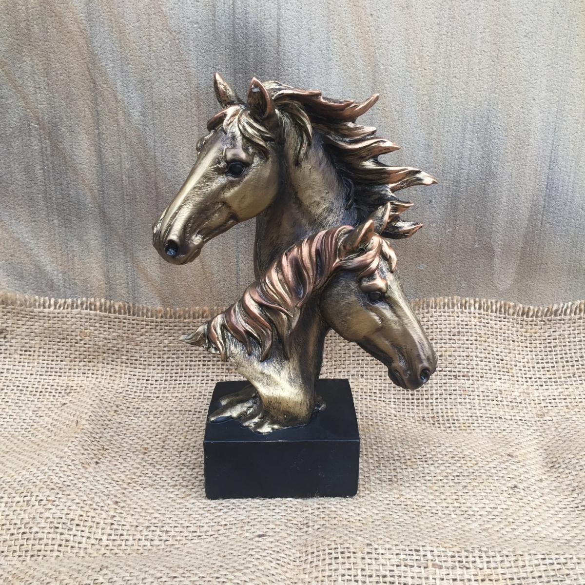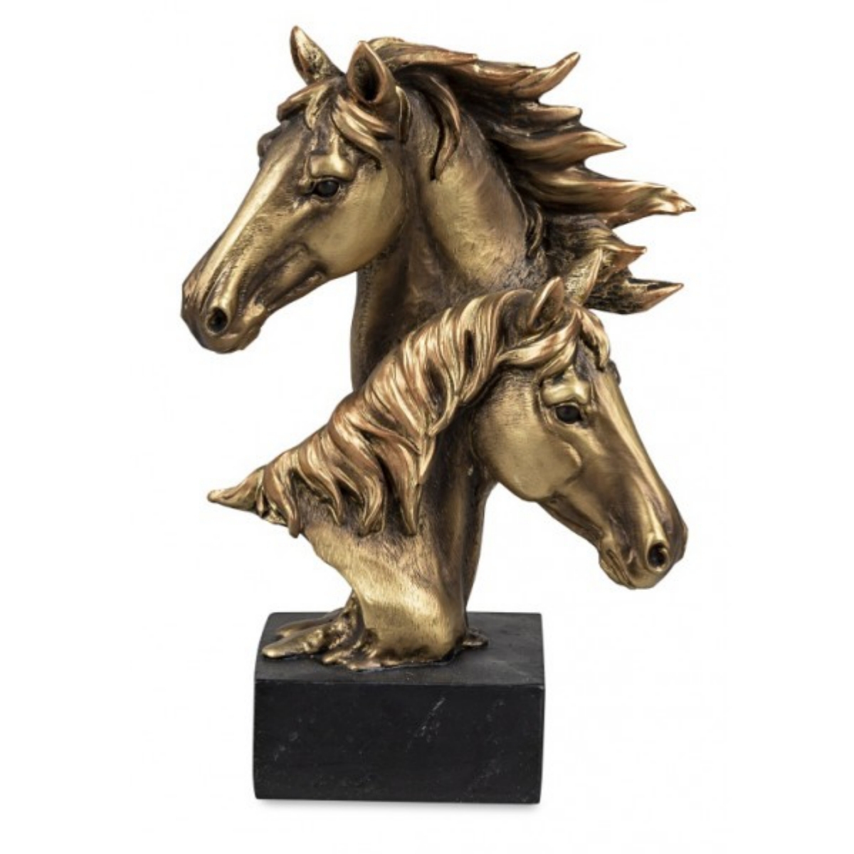 Dekorácia do bytu v podobe nádherne stvárnenej busty dvoch koní je vyrobená z polyresinu v zlatej farbe ANTIK s čiernym vytieňovaním. Kone sú prepracovaní do posledného detailu a celé toto sochárske dielo doslova berie dych.
