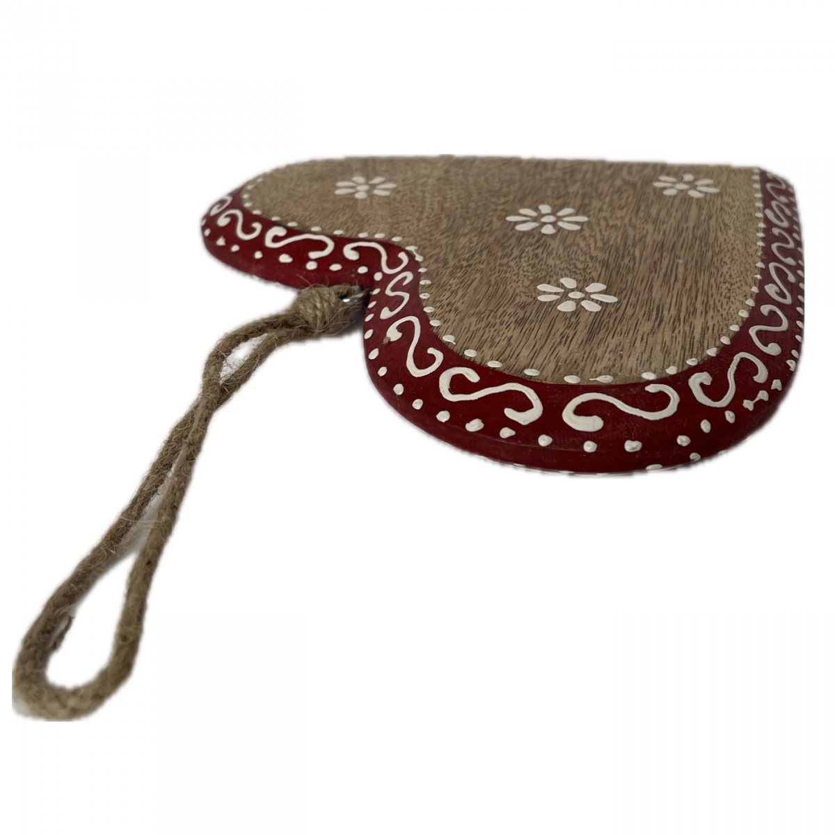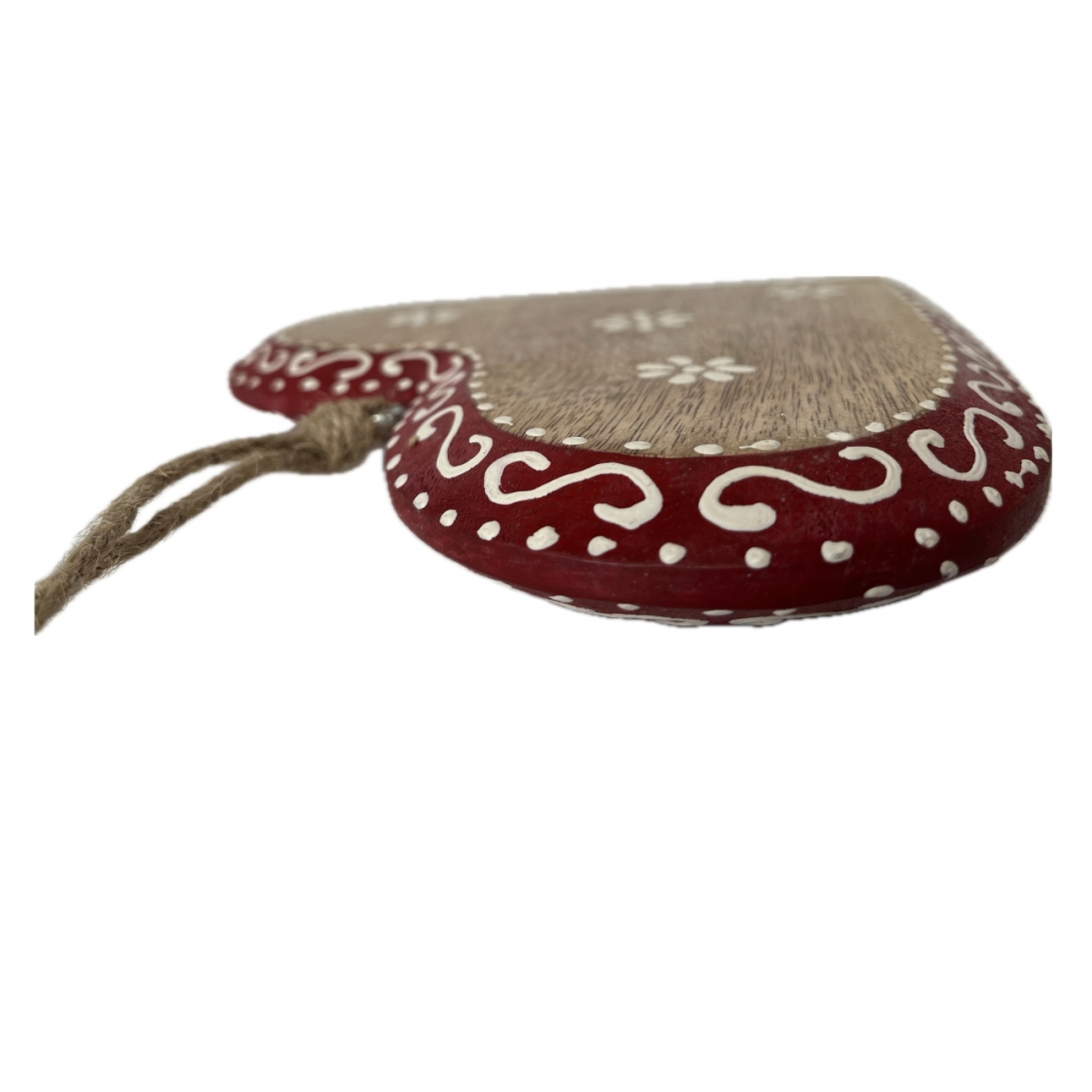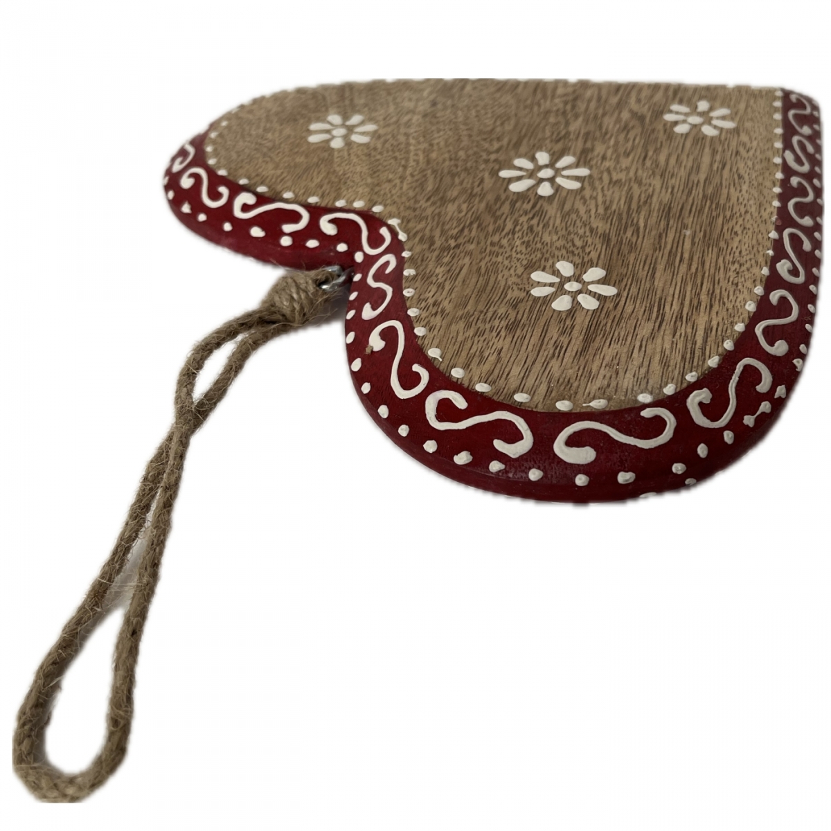 Srdce je v poslednom kroku ručne vymaľované, opoatrené kovovým háčikom a jutovým povrazom na zavesenie. Môže tak slúžiť ako závesná dekorácia aj na položenie na komodu.