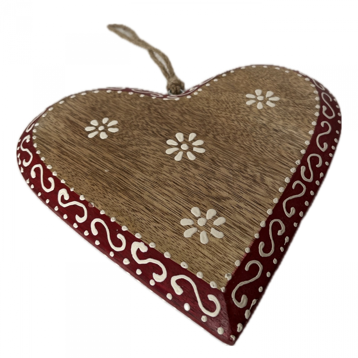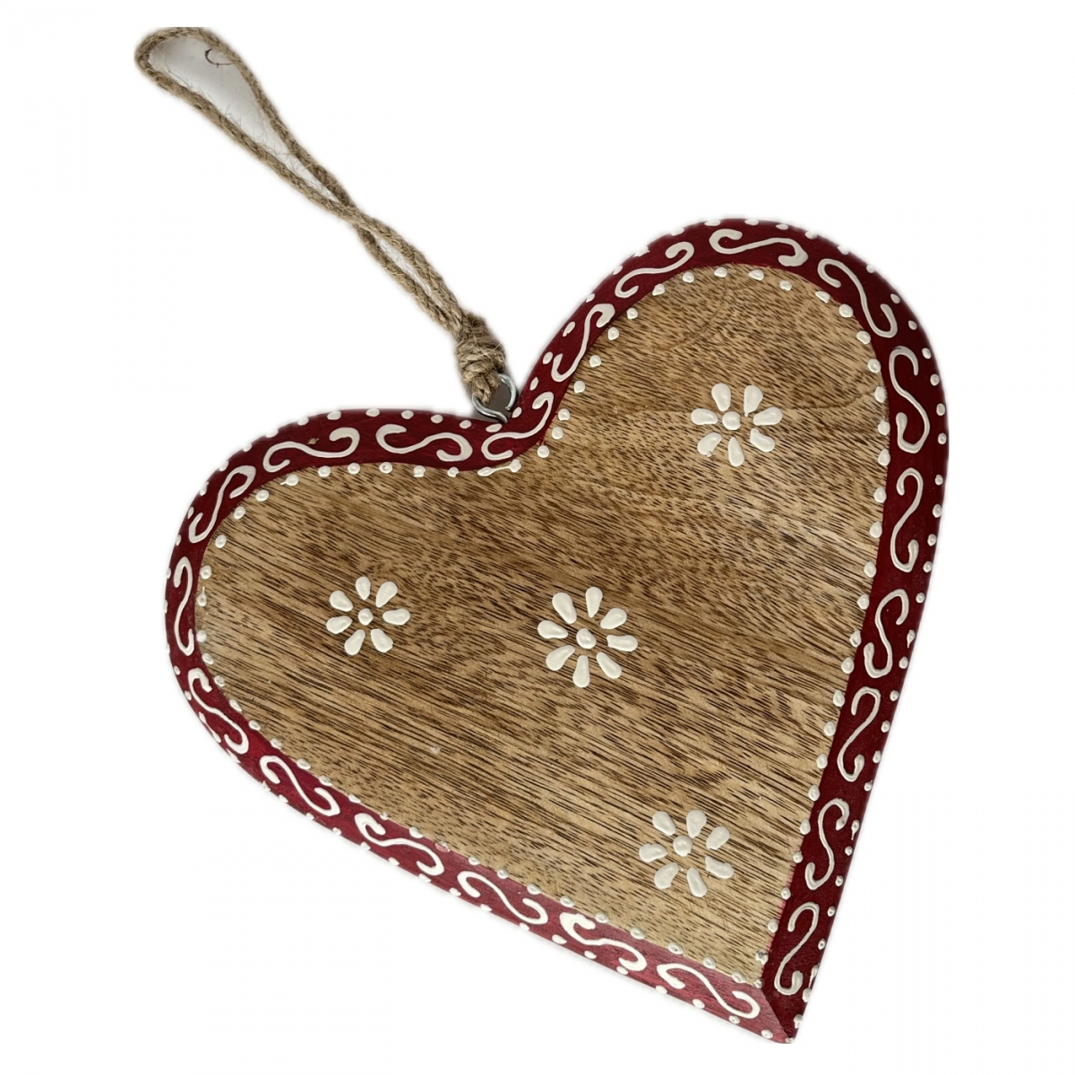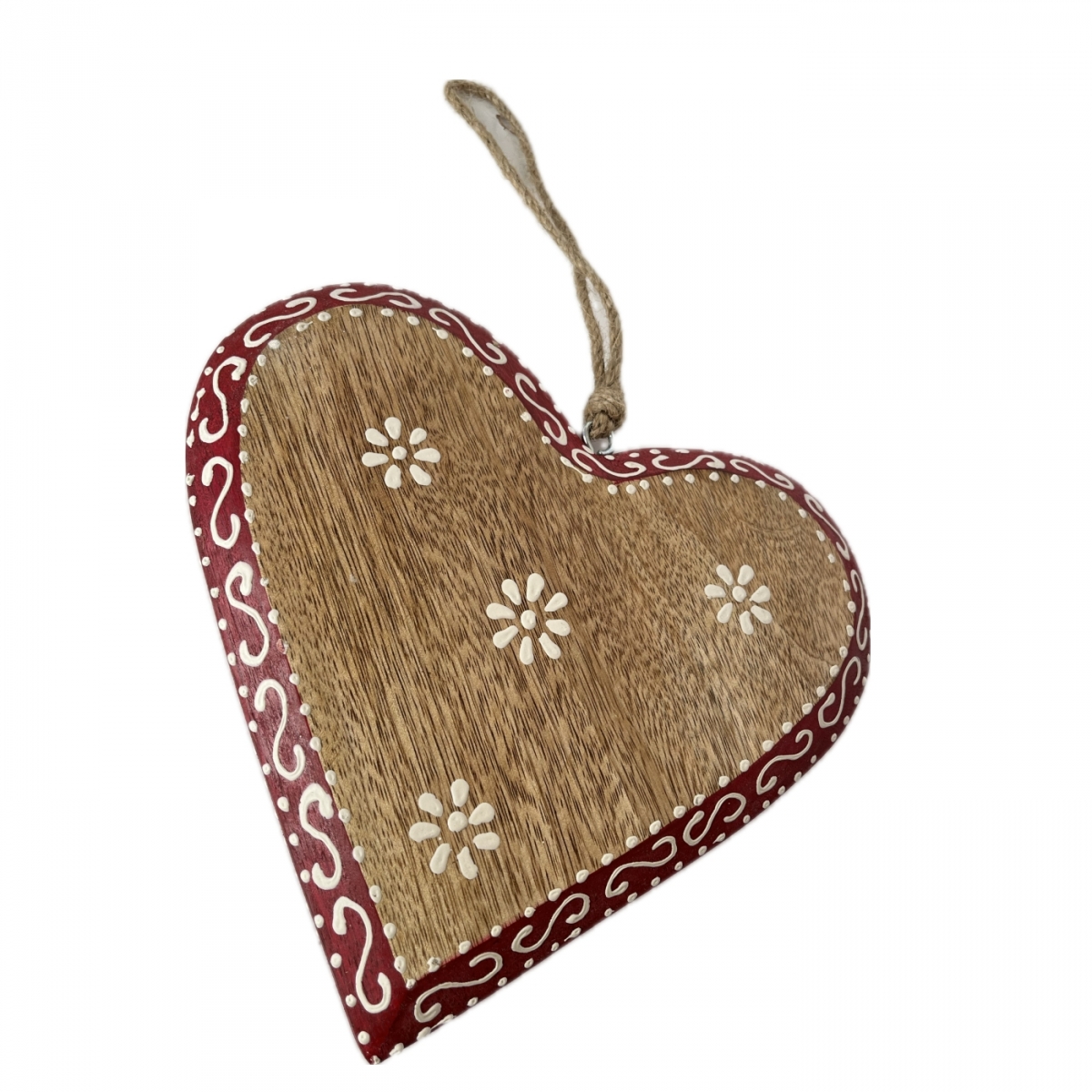 Srdce je v poslednom kroku ručne vymaľované, opoatrené kovovým háčikom a jutovým povrazom na zavesenie. Môže tak slúžiť ako závesná dekorácia aj na položenie na komodu.