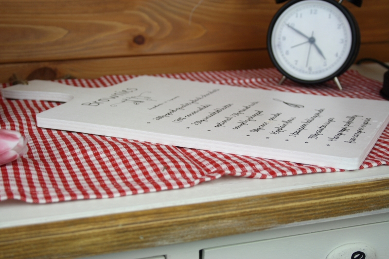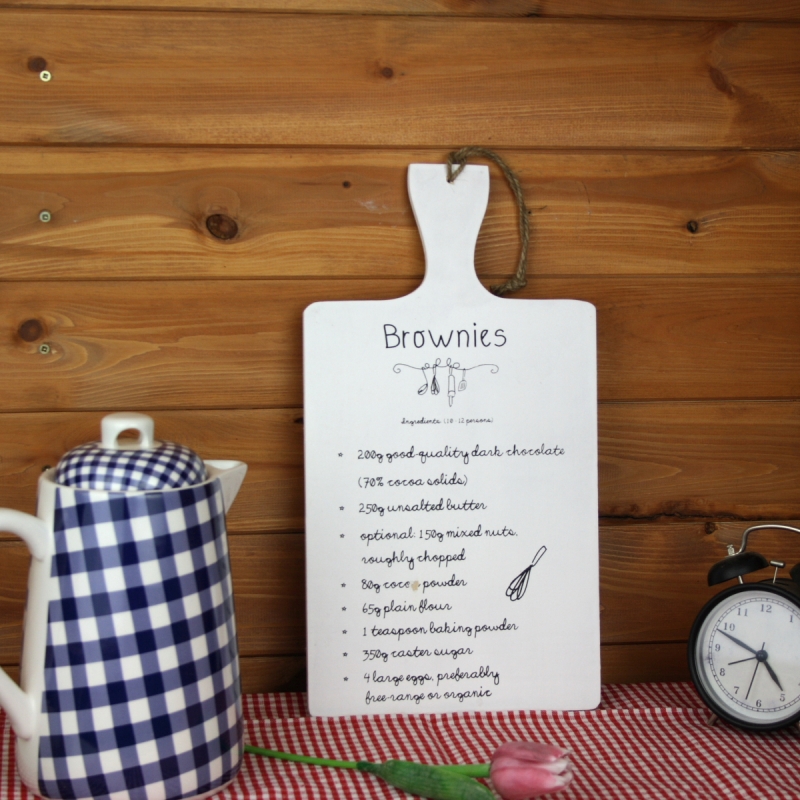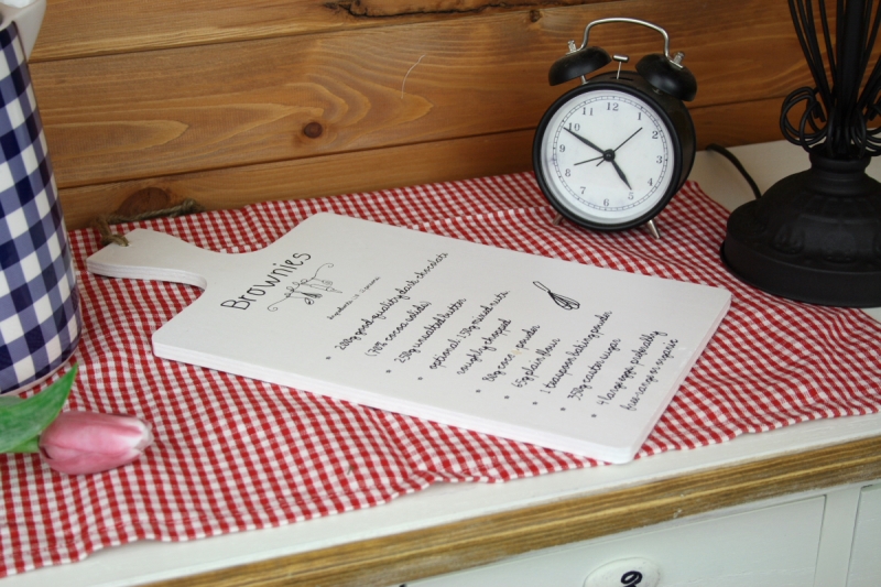 Dekoračné lopárik nám oznamuje recept na lahodné brownies. Doštička slúži len ako štýlová dekorácia, ale recept môžete pokojne vyskúšať. V ponuke nájdete ešte jedno doštička s receptom na brownies.