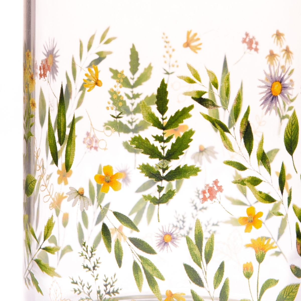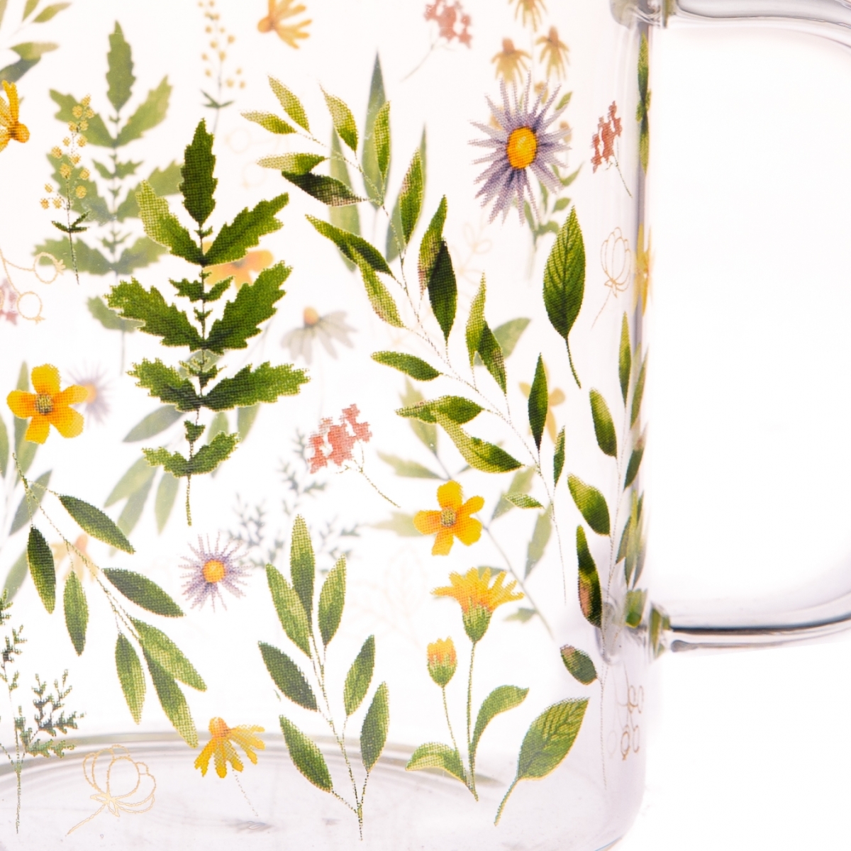 Dekorácia do kuchyne z kolekcie Lúčne kvety obsahuje veľké sklenené hrnčeky, maľované poháre, hrnčeky v tvare šálok na čaj, dózy s bambusovými viečkami rôznych objemov a maľovaný chalupársky džbán na vodu zo studne. Každý kúsok je ručne vyrobený pre najvyššiu kvalitu a autentickosť.