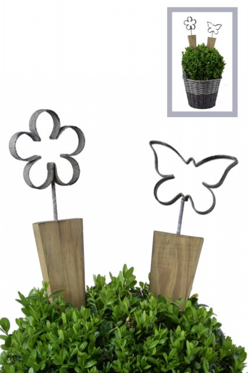 Zápich do kvetináča je drevený a ozdoba v tvare kvetiny s patinou je kovová. Dekorácií do kvetináčov nájdete v ponuke hneď niekoľko, môžete ich veselo kombinovať, pretože spolu pekne ladia.