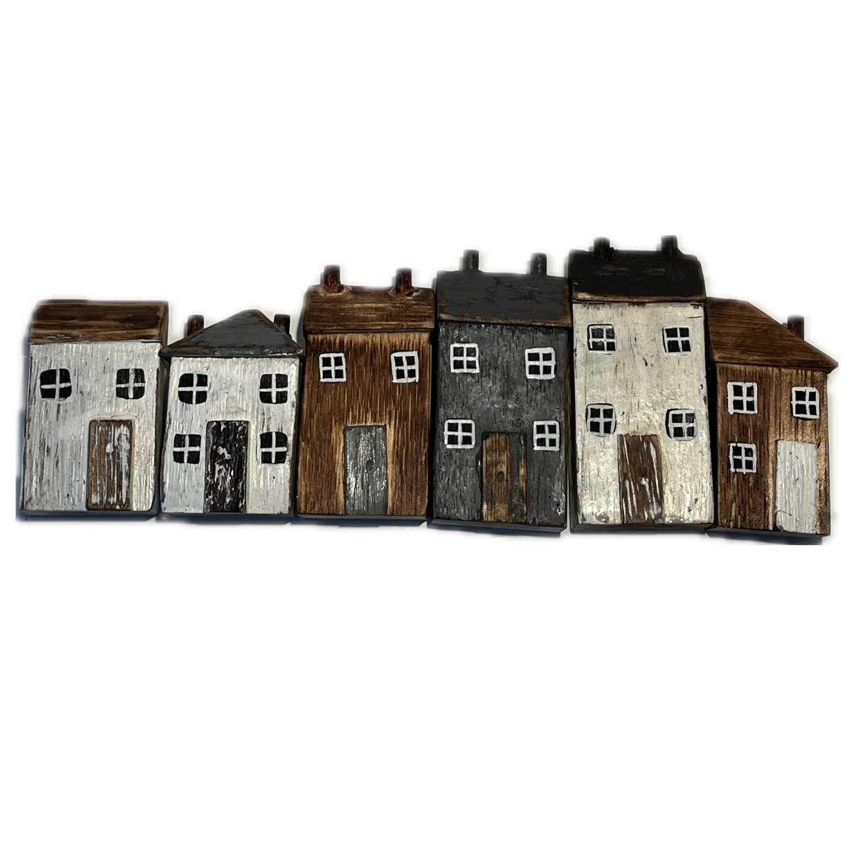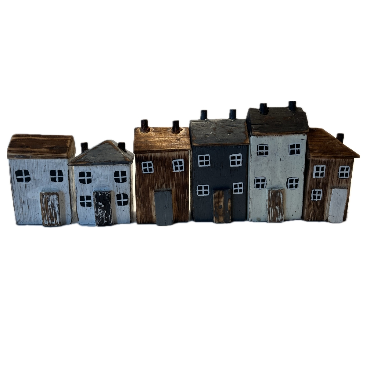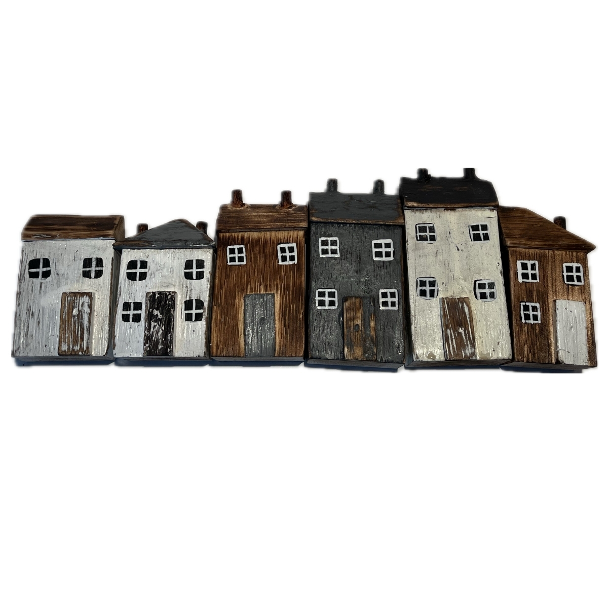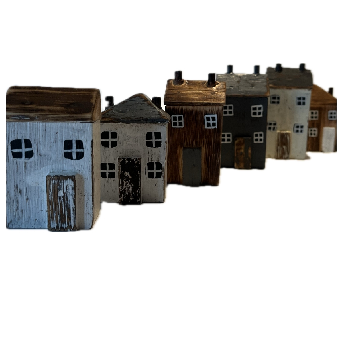 Drevená dekorácia domčeky v sade 6 kusov rôznych farieb a tvarov. Ich veľkosť je ale v rovnakom pomere k skutočnosti. Môžete teda domčeky ľubovoľne rozmiestniť jednotlivo, alebo z nich vytvoriť radovú zástavbu vašej poličky.