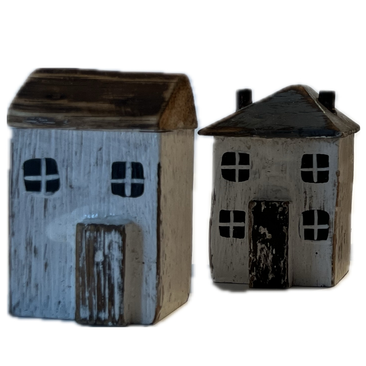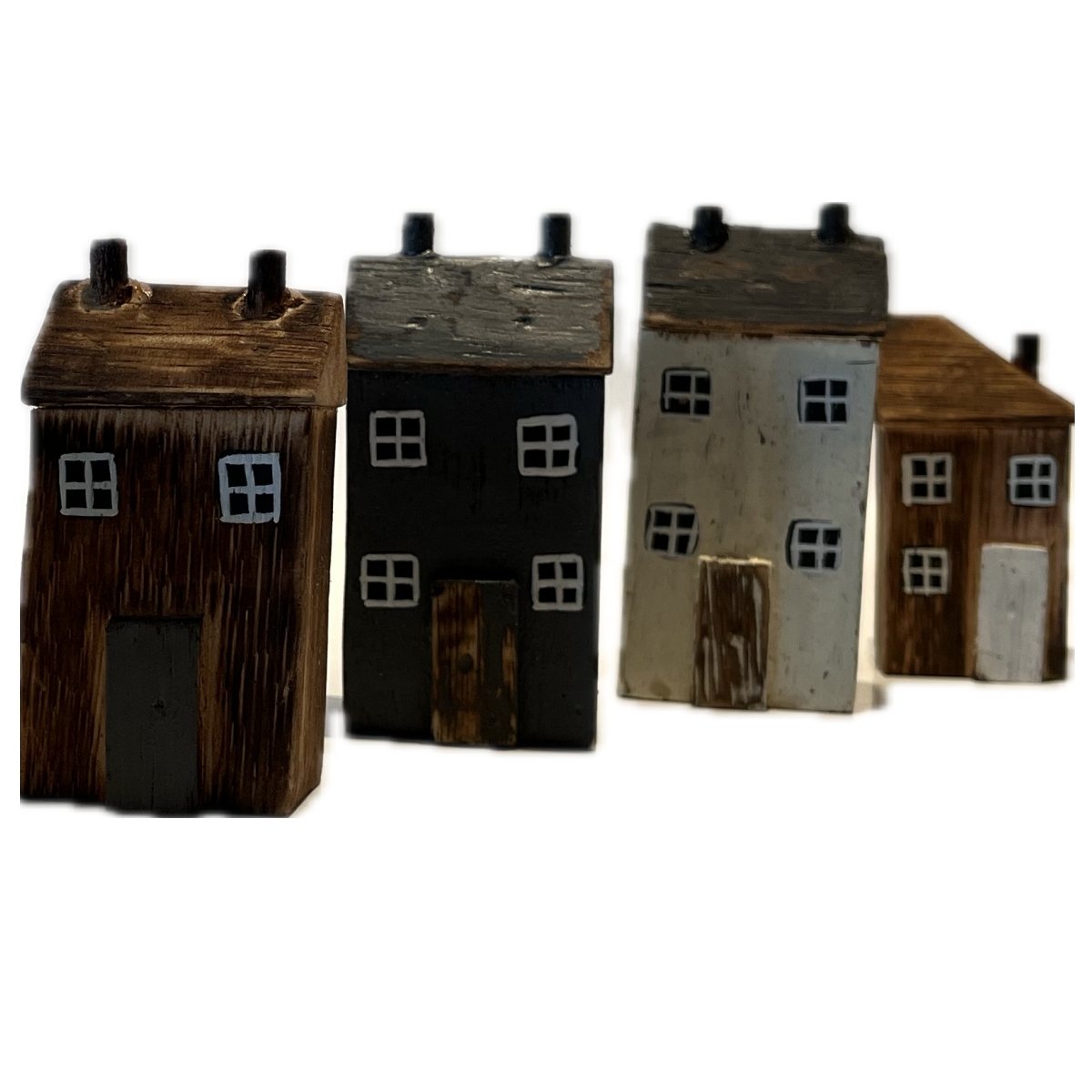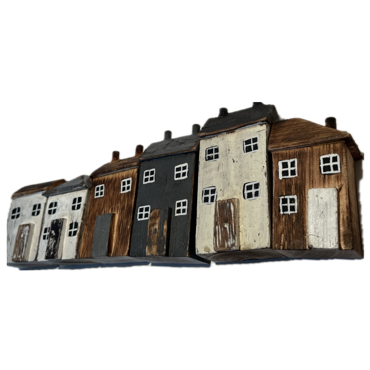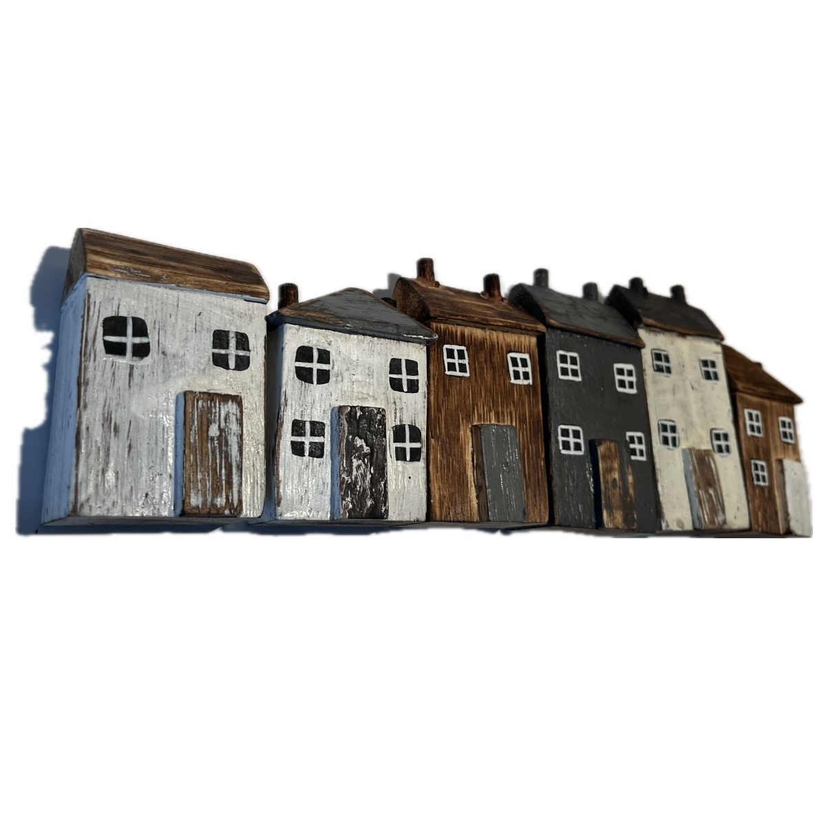 Drevená dekorácia domčeky v sade 6 kusov rôznych farieb a tvarov. Ich veľkosť je ale v rovnakom pomere k skutočnosti. Môžete teda domčeky ľubovoľne rozmiestniť jednotlivo, alebo z nich vytvoriť radovú zástavbu vašej poličky.