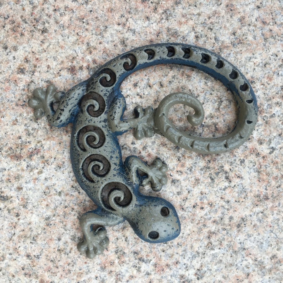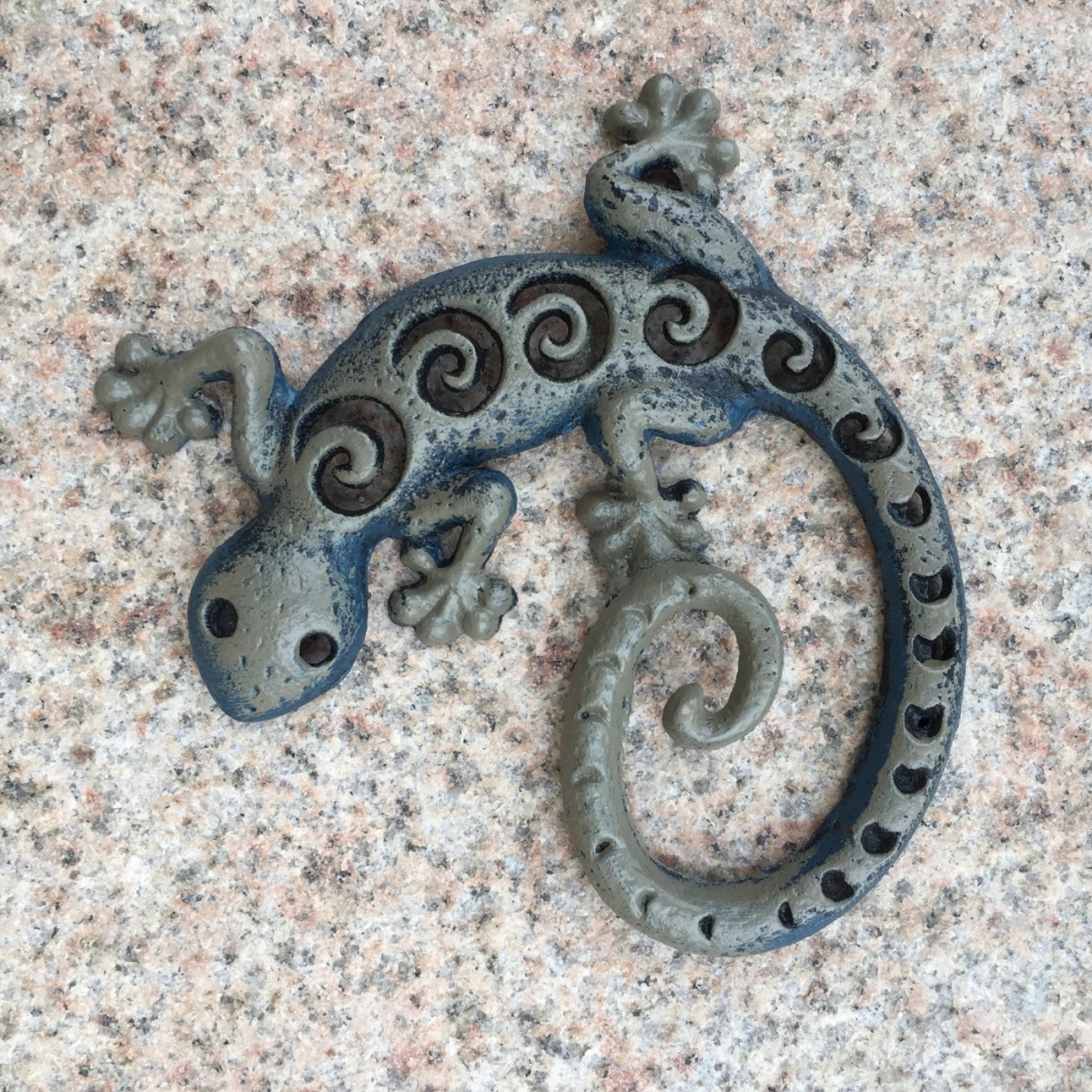 Dekorácia k jazierku v podobe farebnej liatinovej jašterice v netradičnej farebnej kombinácii. Modro šedý podklad a svetlá béžovo zelená výrazná patina robí z tejto dekorácie do záhrady zaujímavý kúsok. Čo kus to farebný originál.