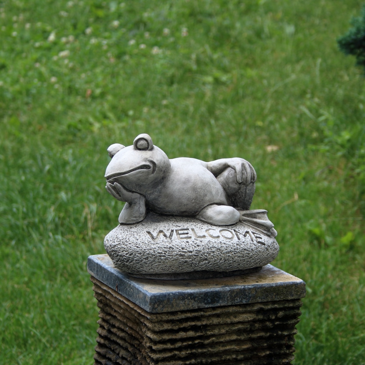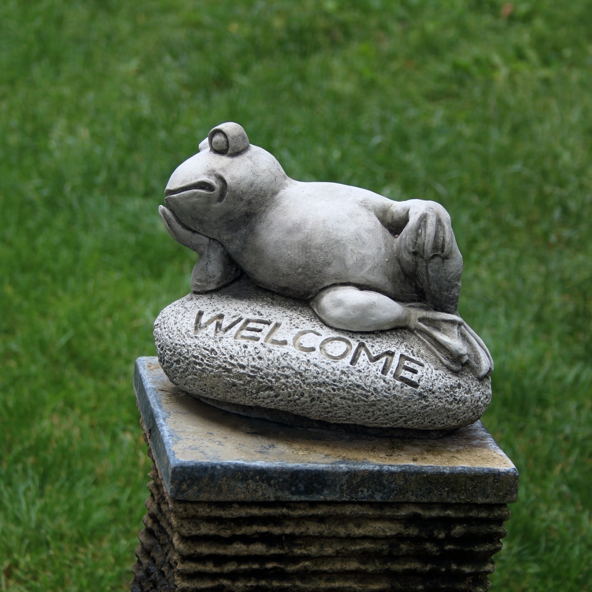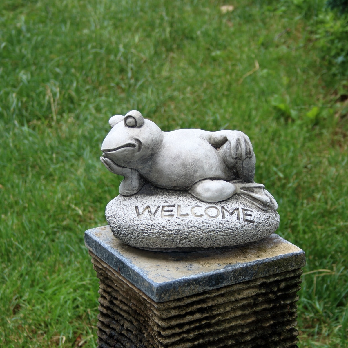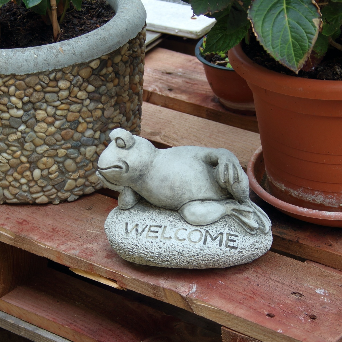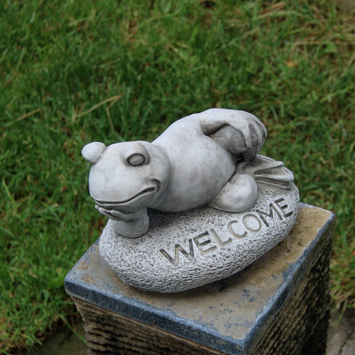 Dekorácia k jazierku v podobe žaby na kameni s nápisom WELCOME (Vitajte)