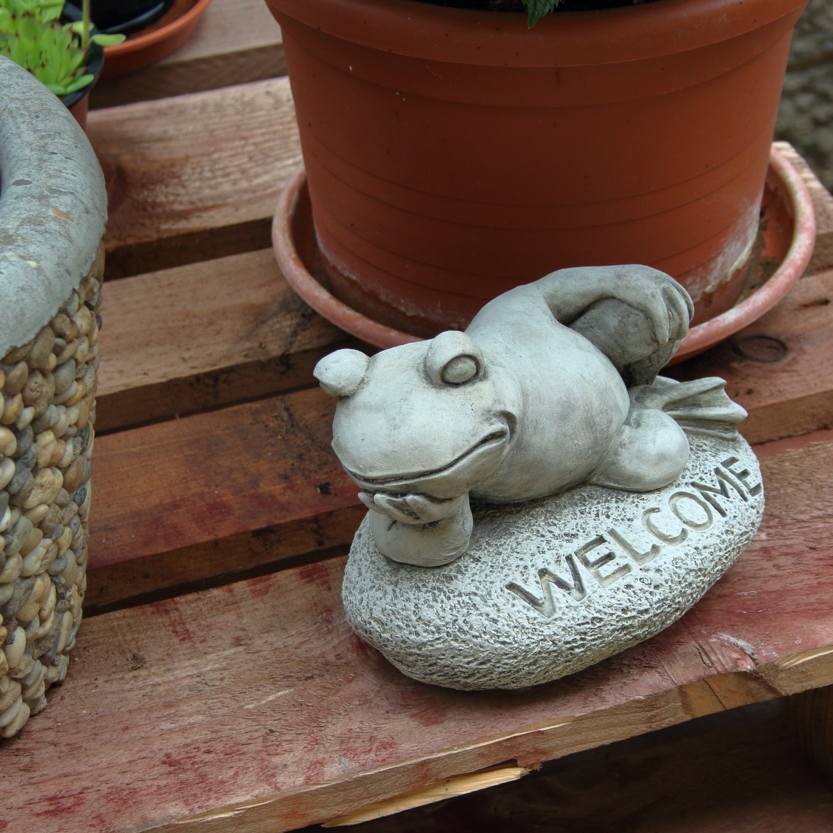 Dekorácia k jazierku v podobe žaby s nápisom WELCOME je vyrobená z betónu, takže jej voda rozhodne nevadí! Časom dokonca získa prírodný štýlovú patinu.