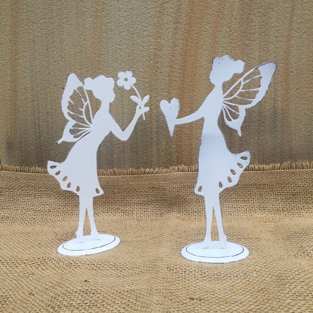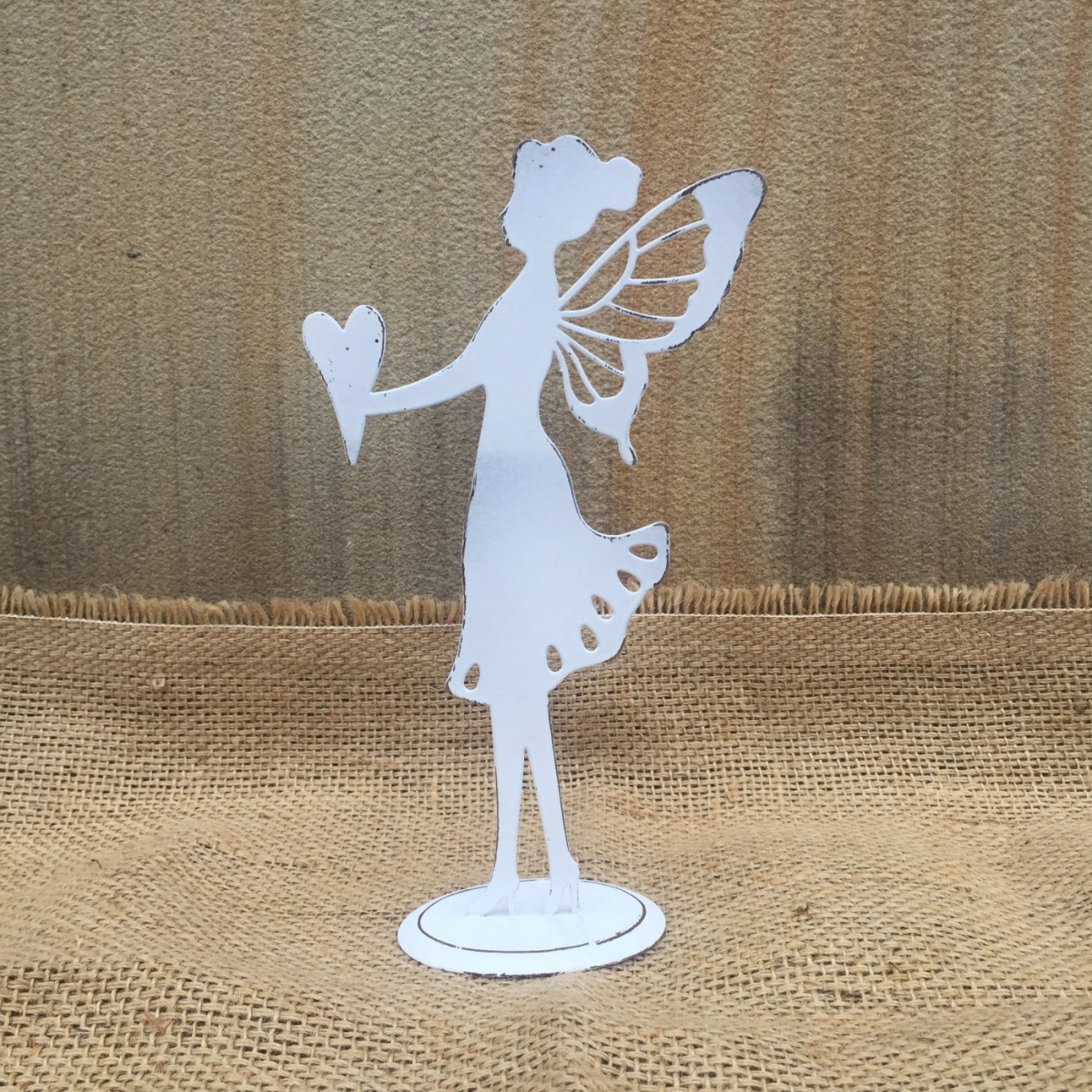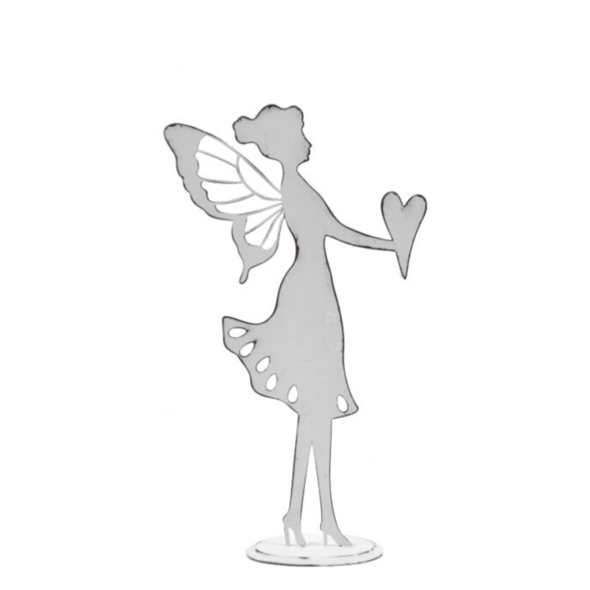 Dekorácia víla je vyrezaná z kovu s perforovanými krídlami a lemom sukienky. V ruke pred sebou drží srdiečko. Celá táto bytová dekorácia je opatrená bielym náter, vďaka ktorému ju možno ľahko začleniť do prostredia v rôznych farebnostiach. V našej ponuke nájdete aj vílu s kvetinou.