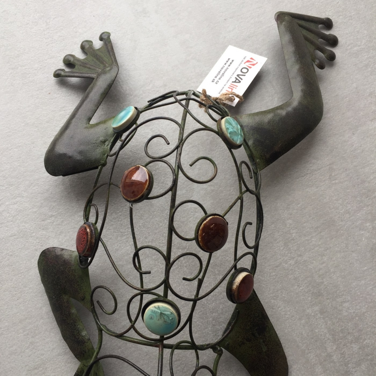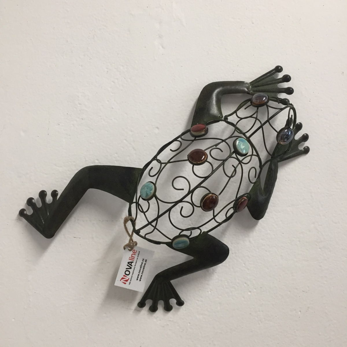 Dekorace na zeď žába oživte Vaší zahradu, pergolu, či interiér touto kovovou nástěnnou dekorací, které doplňuje zdobení pestrobarevných kamínků se zajímavými odlesky při dopadu slunce.