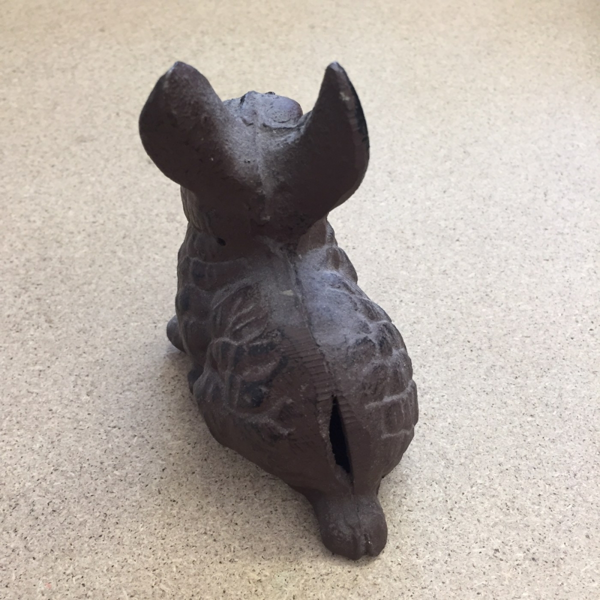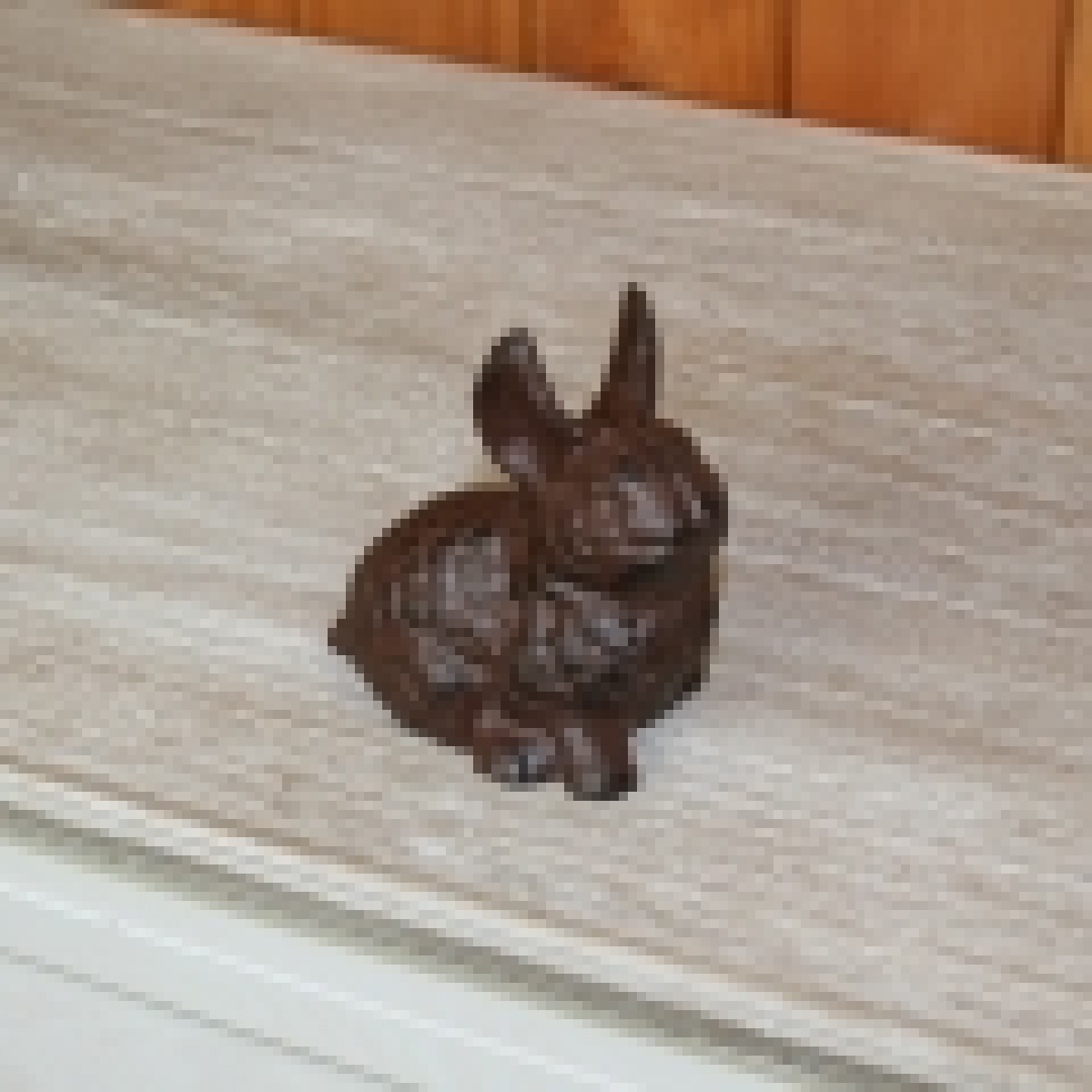 Dekorácia na záhradu v podobe liatinovej sošky zajačika je vyradená z dôvodu nedokonale vytvoreného odliatku. Zajac má na chrbte malý otvor, ktorý ale možno vidieť iba pri detailnom pohľade.