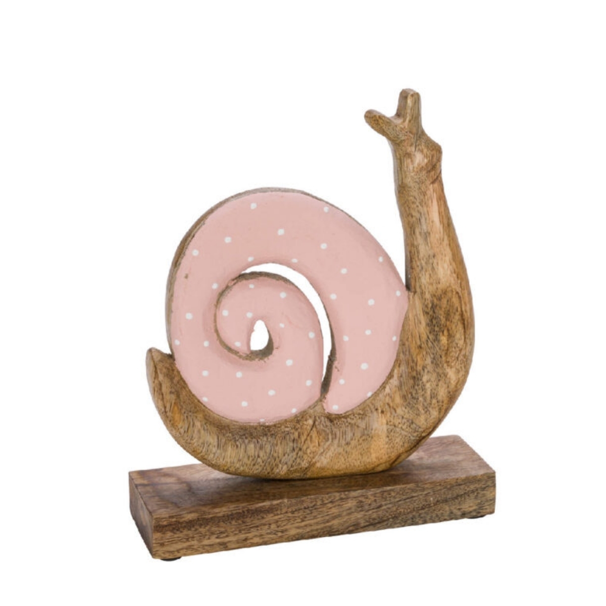 Táto slimačia dekorácia sa hodí na poličku aj priamo na zem, pretože tento slimáčik nie je žiadny drobček. Kombinuje na sebe krásnu kresbu mangového dreva na tele a podstavci, s pastelovou ružovou s bielymi bodkami na svojej ulite.