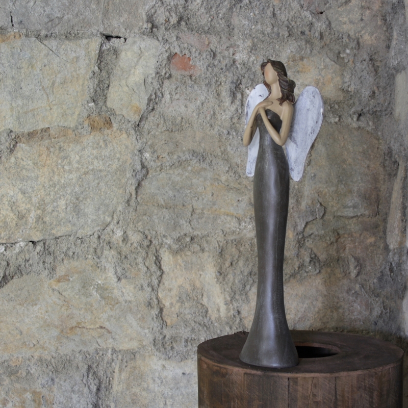 Anjel, alebo skôr "Andelko", je oblečená do hnedých šiat a má veľká biela krídla s patinou. Soška meria 34cm čo Vám zaručuje, že sa stane dominantou každej police či komody.