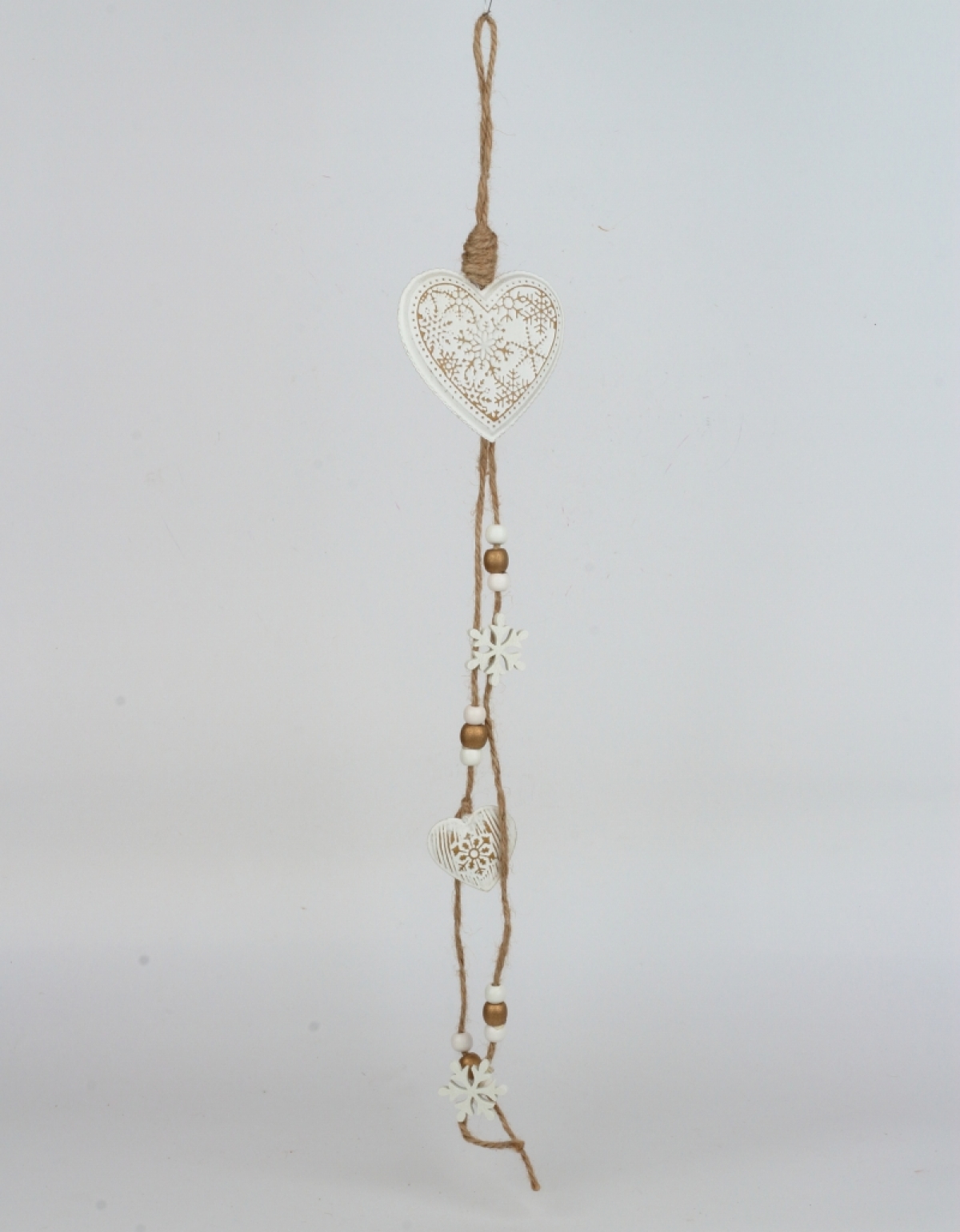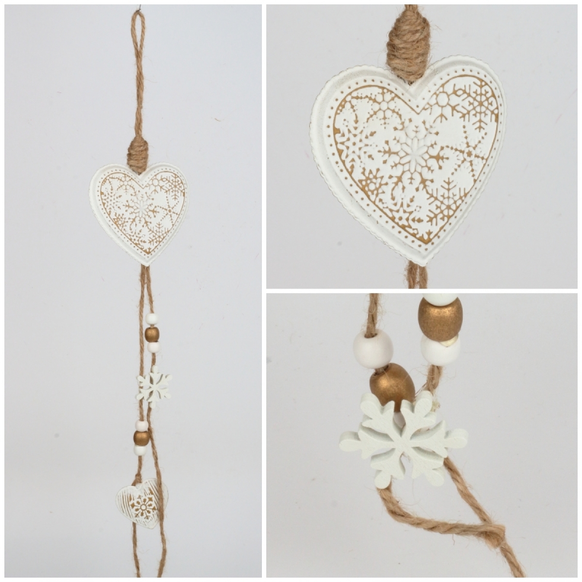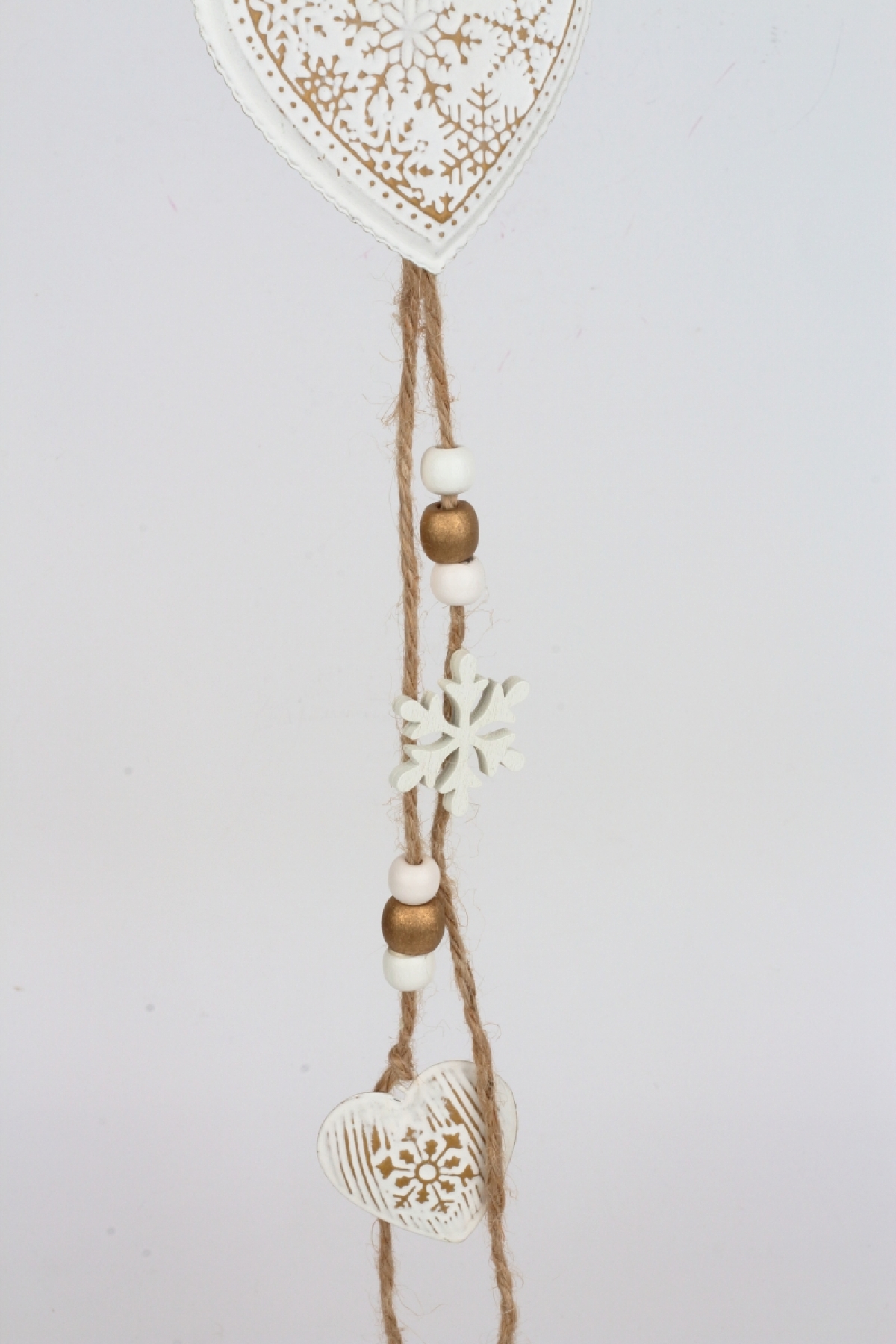 Srdiečko slúži ako závesná dekorácia. Má na sebe zavesené menšie srdiečko a vločky s korálkami. Celková dĺžka je 55 cm.