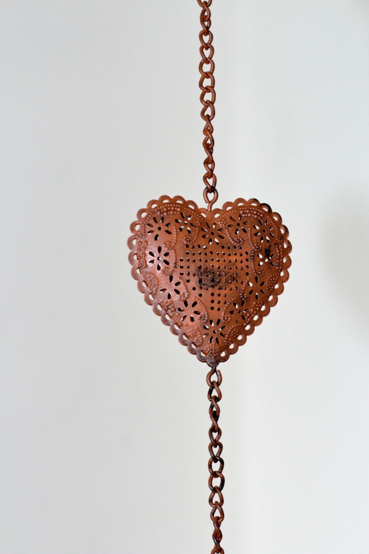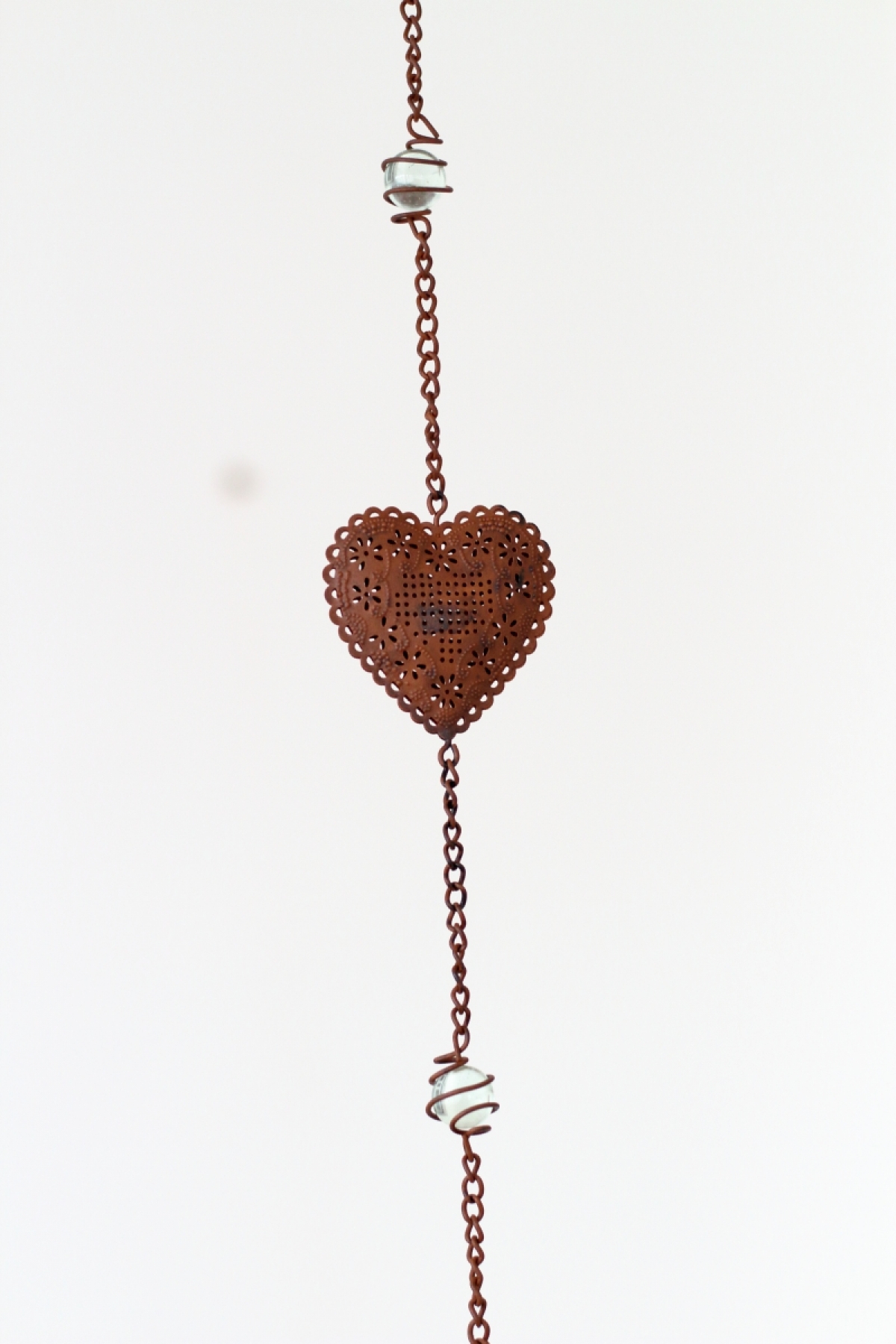 Závesná dekorácia do záhrady má ozdobu srdca o veľkosti cca 15,5cm a menšieho 6,5x6,5cm z perofrovaného plechu.