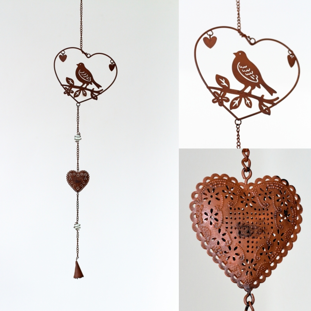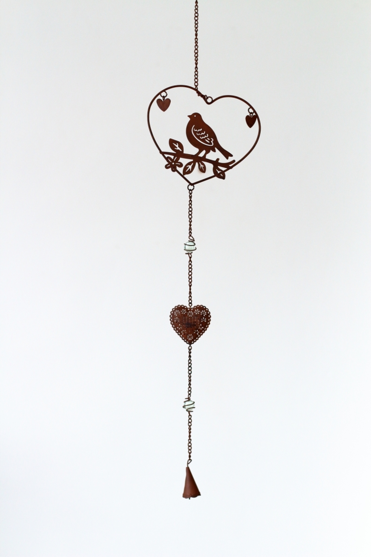 Dekorácie do záhrady záves s vtáčikom 82cm srdca