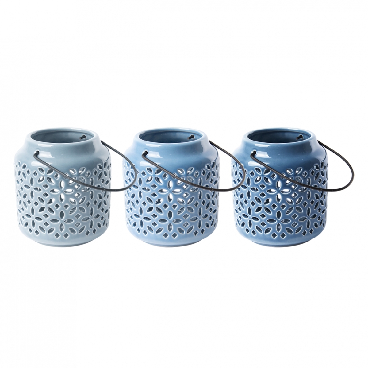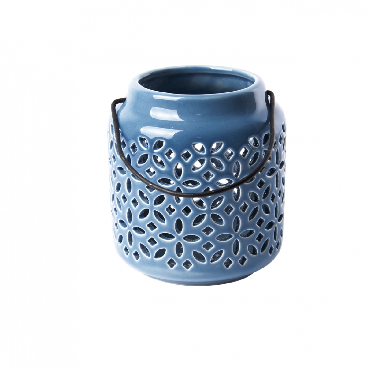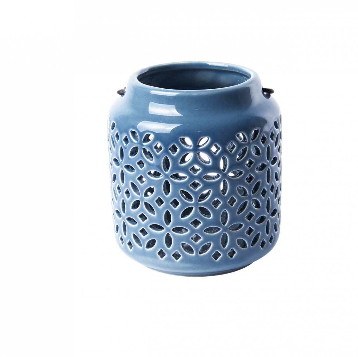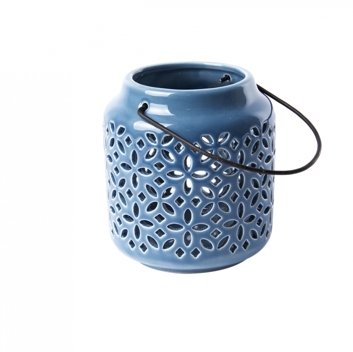 Dekorácie lucerna na sviečku z keramiky v tmavo modrej farbe s ornamentami.