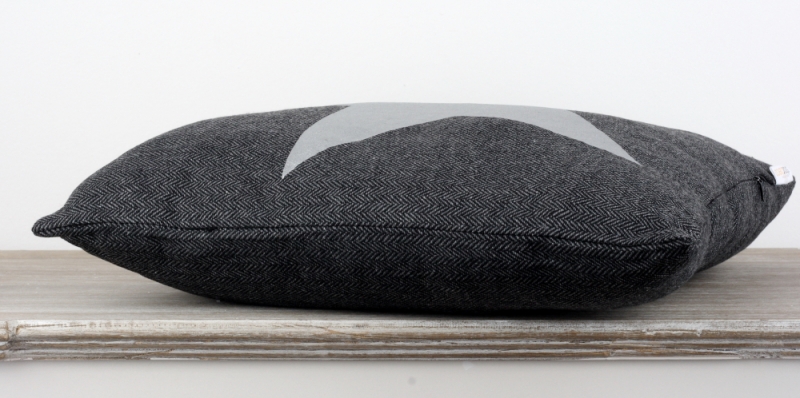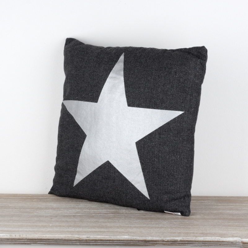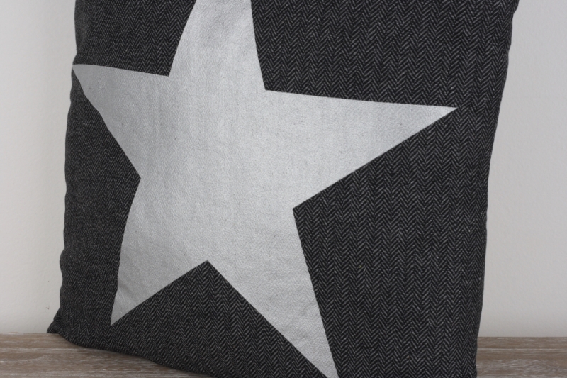 Dekoračné vankúš hviezda čierny 45x45cm zo silnejšej štruktúrovanej látky s motívom hviezdy sa nesie v odtieňoch šedo-čiernej farby v kombinácii so striebornou hviezdou.