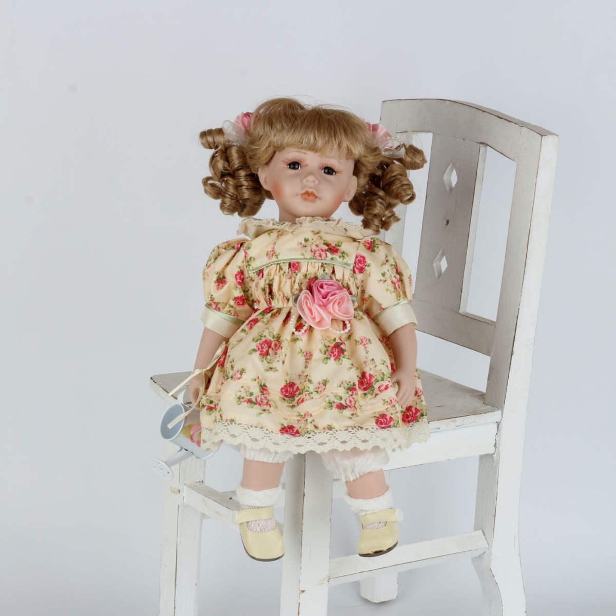 Dekoratívna porcelánová bábika Valerie má krásne kvetované šaty, doplnené o štýlovú kanvičku. Pohodlne si môže sedieť na čestnom mieste na poličke alebo vo vitríne.