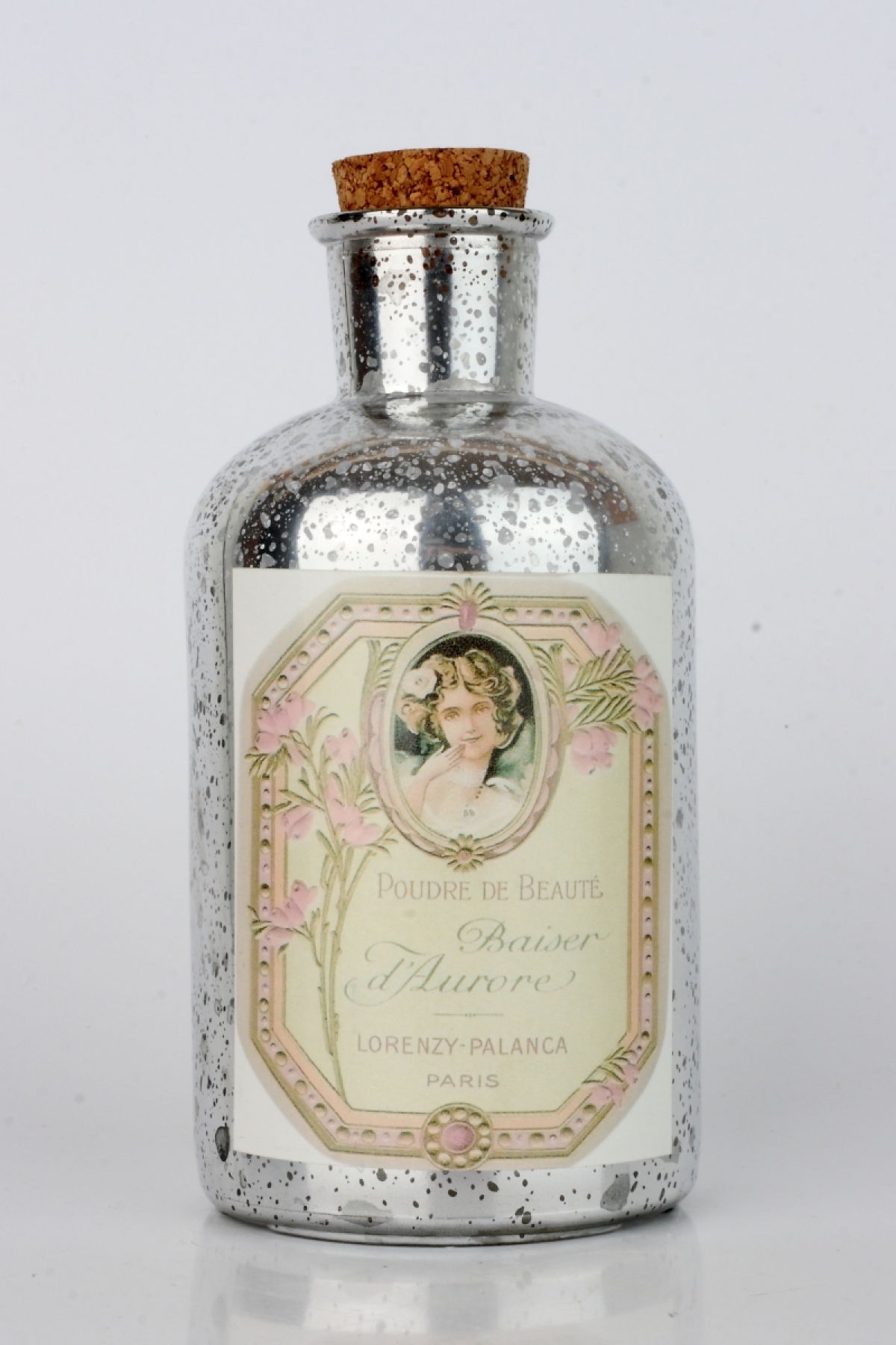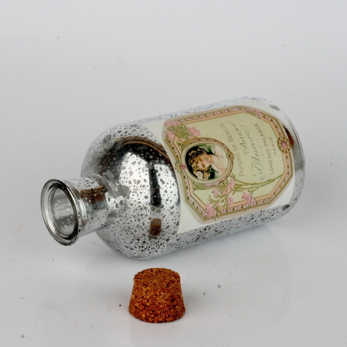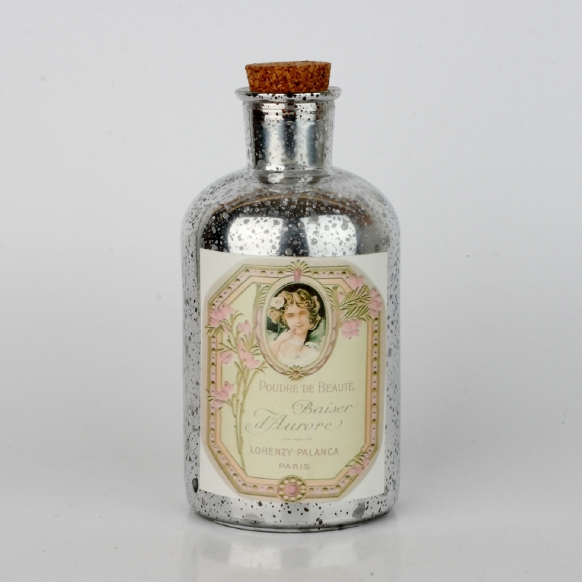 Veľmi originálna a dekoratívna postriebrená sklenená fľaša s korkovou zátkou.