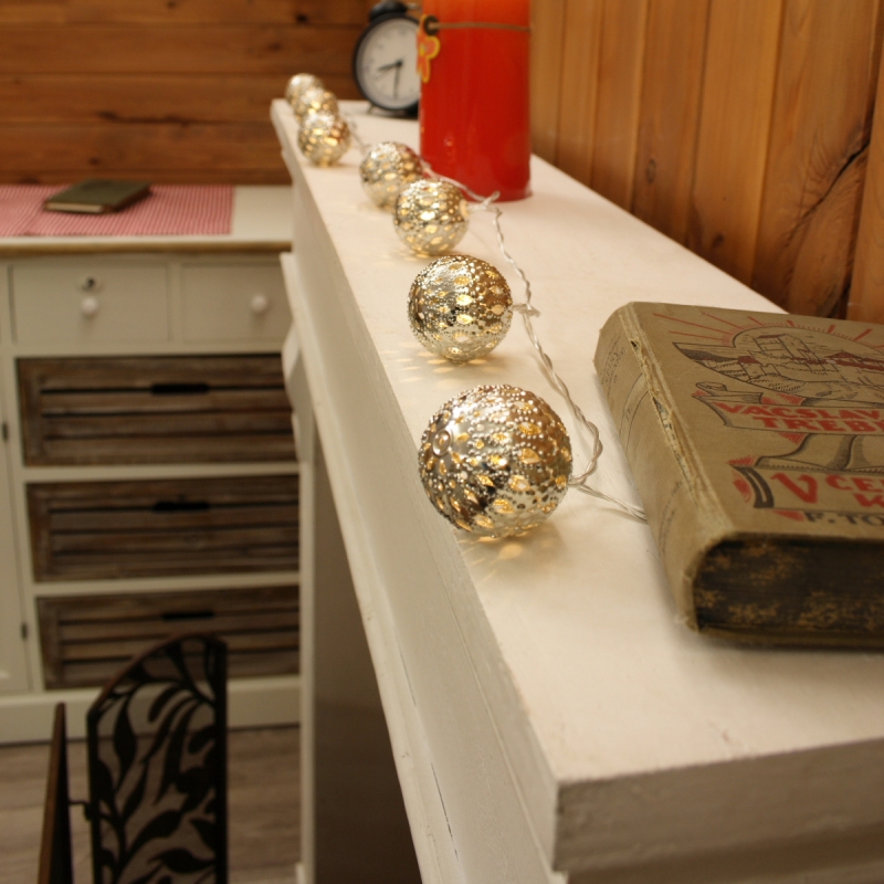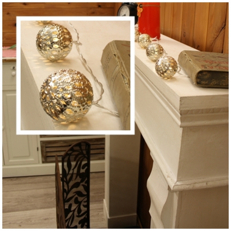 Dekorativní vánoční osvětlení koule 130 cm na krbovou římsu Nebo polici ČI komodu. pračce Kovové kouličky s ozdobnými otvory propouštějí krásné tlumené světlo, Které dotváří atmosféru VANOC. Řetěz využijete Však i Behem celého roku. Univerzální motiv Muze sloužit Jako dekorace v obývacím pokoji, ložnici i dětském pokoji Nebo. pračce Rozměry: Celková delka 130cm, 8 světelných kovových ozdob ve tvaru vánočních koule o průměru 4 cm