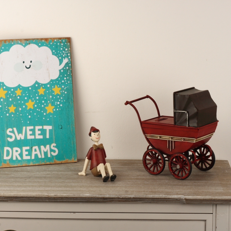 Detská pokladnička koč 28x16x26cm ako praktická dekorácia do detskej izby, do ktorej môžete šetriť deťom korunku ku korunke. Alebo necháte je samotné, aby si šetrili?
