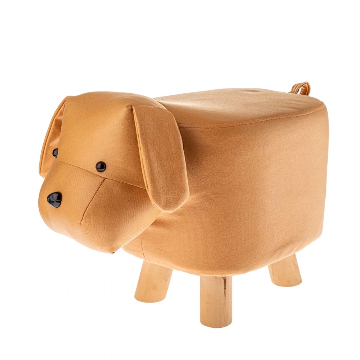 Tento taburet / detská stolička v tvare psíka (rozmery cca 28 × 45 × 24 cm) je stvárnený s láskavou hrou detailov – okrúhly ňufáčik, ušká, labky. Farby sú jemné, pastelové, materiál vyzerajú ako drevo alebo zafarbený masív-look, povrch hladký, bezpečný aj pre malé ruky a nohy.