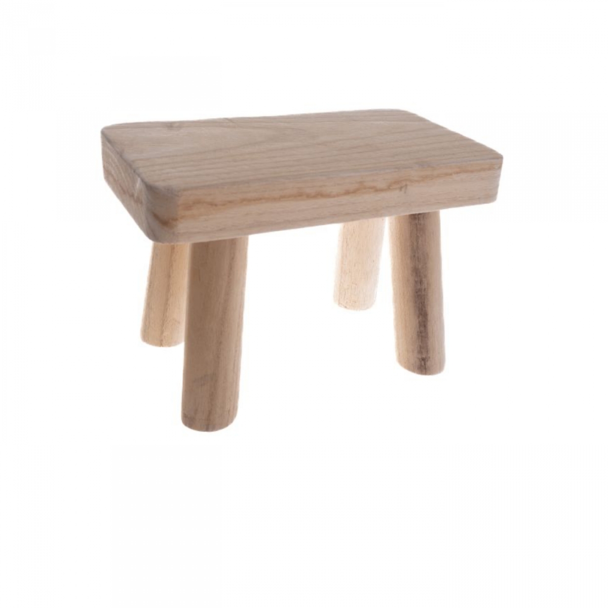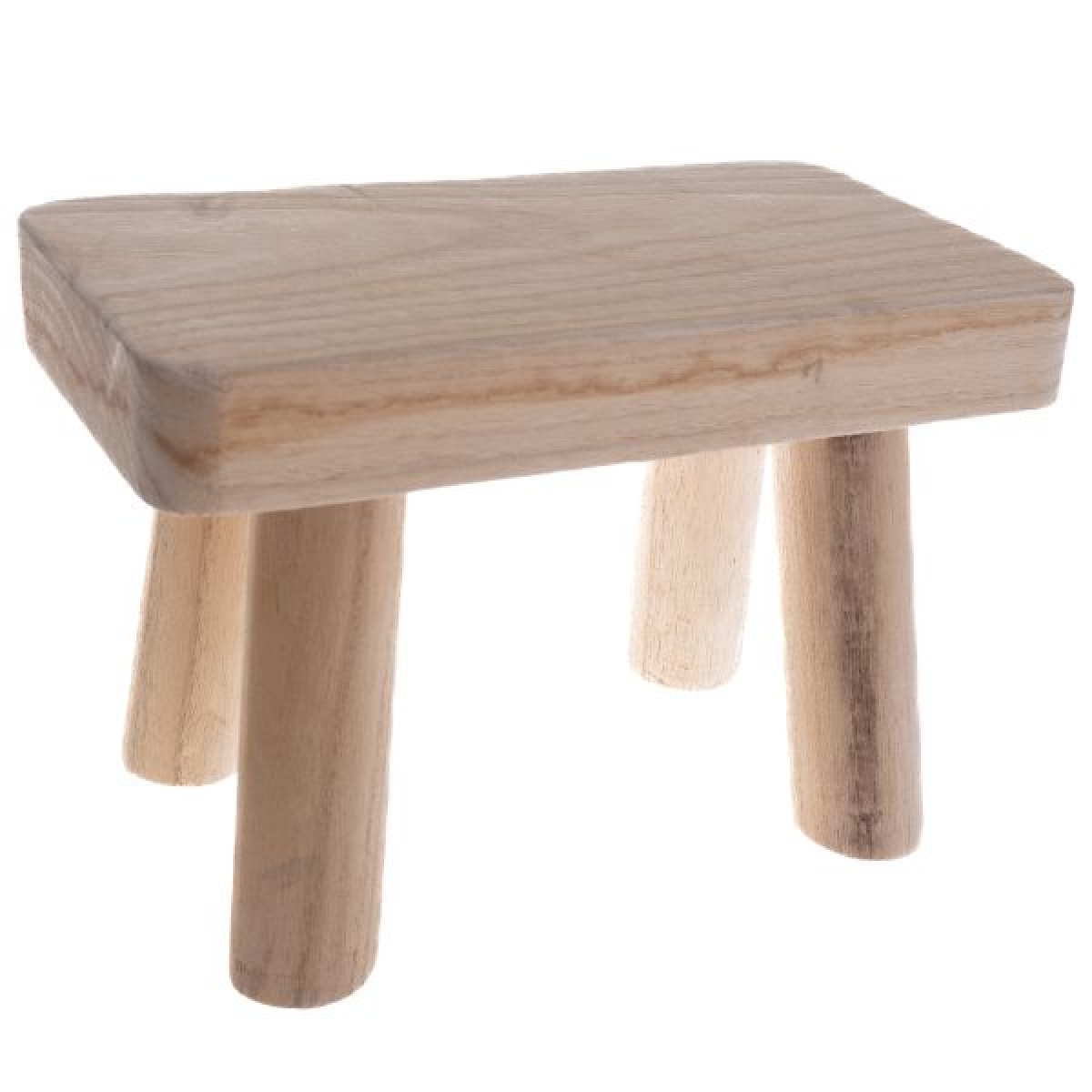 Detská stolička z dreva s rezmerom 23 x 13 x 15 cm, môže slúžiť za vchodovými dverami na uľahčenie obúvania detí pred odchodom z domu.