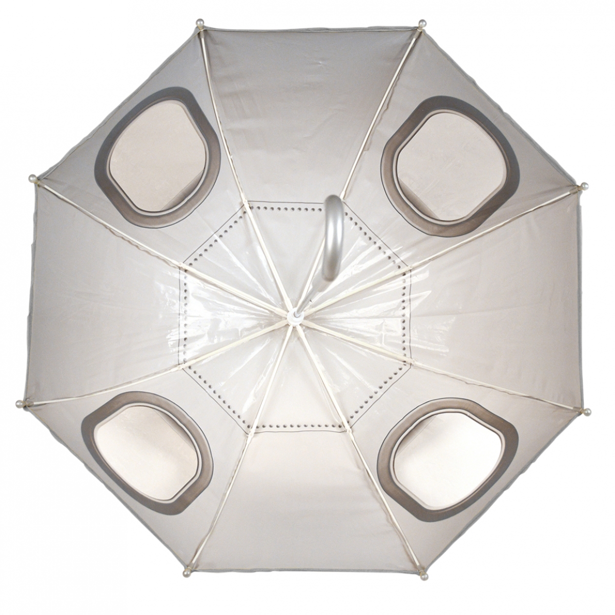 Nápaditý dáždnik je vybavený štyrmi priehľady, ktoré vyzerajú ako okna lietadla. Nechýba na ňom autenticke rámovanie okien a dokonca ani nitovanie.