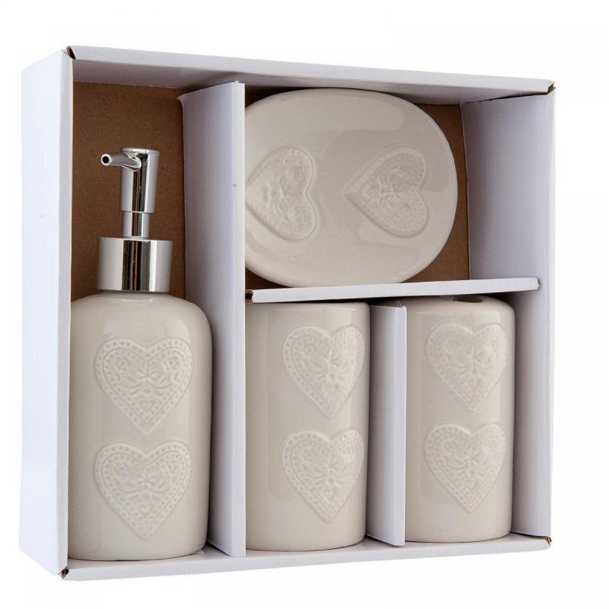 Doplnky do kúpeľne srdca (sada 4ks) v peknom darčekovom balení by si zaslúžila nielen vaša kúpeľňa, ale iste by potešila aj vašich blízkych.
