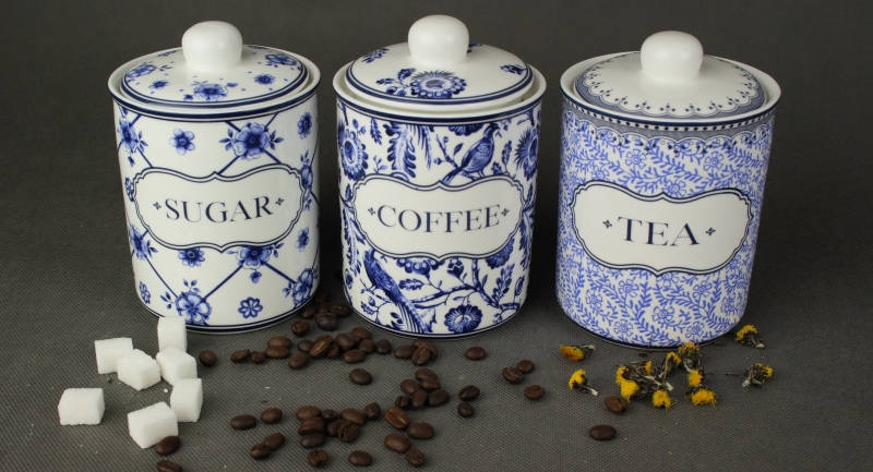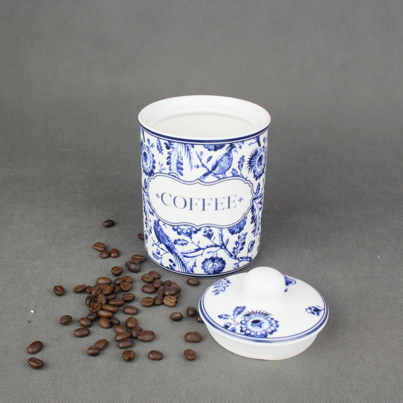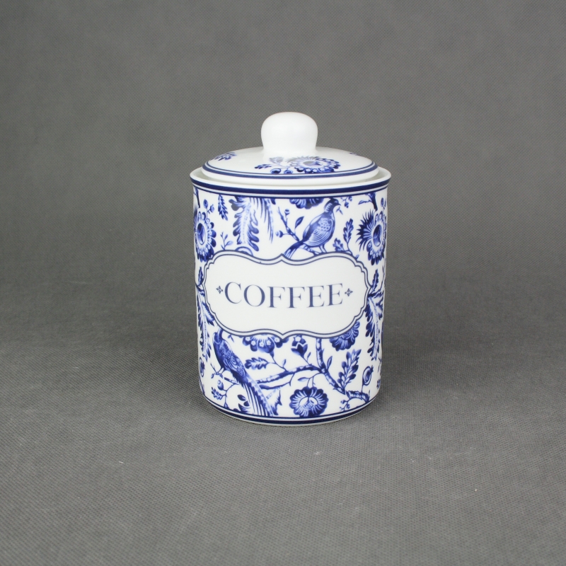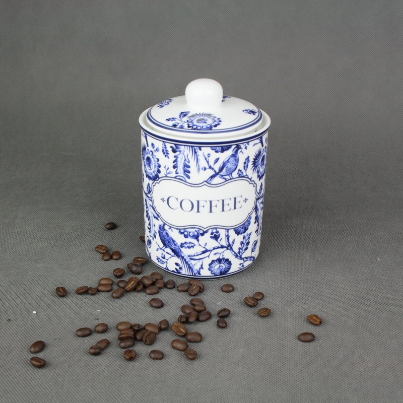 Dóza na kávu coffe vyrobená z keramiky s krásnou bielou leskom glazúrou a modrým maľovaním. Prednú stranu dózy zdobí nápis, ktorý dáva jasne najavo, čo je v dóze skryté.
