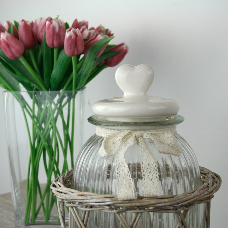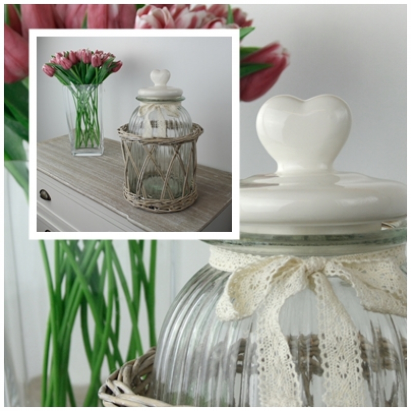 Dóza na potraviny v prútenom košíku bude ozdobou Vašej kuchyne! zmestí sa do nej naozaj veľa sladkostí a cukroviniek, na ktorých si s radosťou zmlsne celá rodina. Sklenená dóza má keramické viečko s tesnením a úchytom v tvare srdca. Celá dóza svojím spracovaním zapadá do romantického vintage štýlu. Ozdobná čipková mašľa je už len takou čerešničkou na torte.