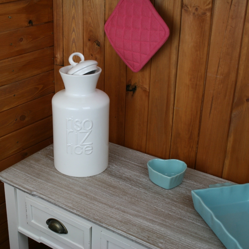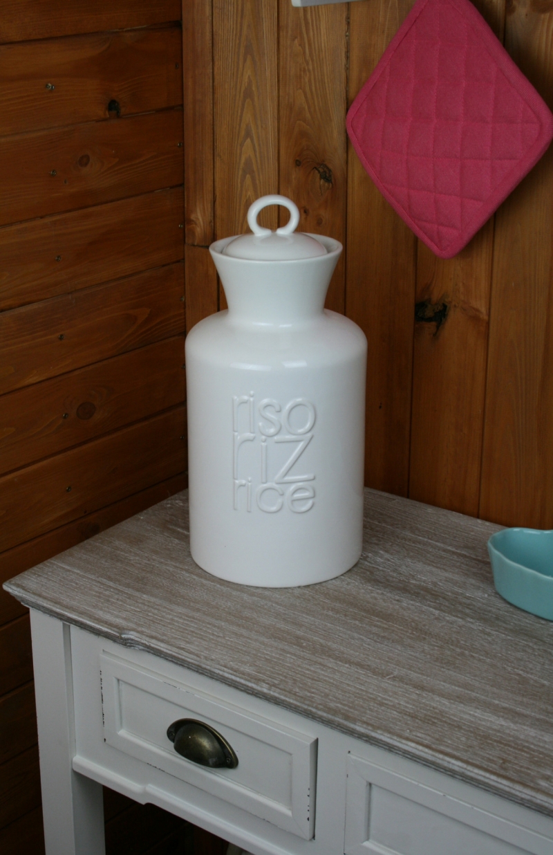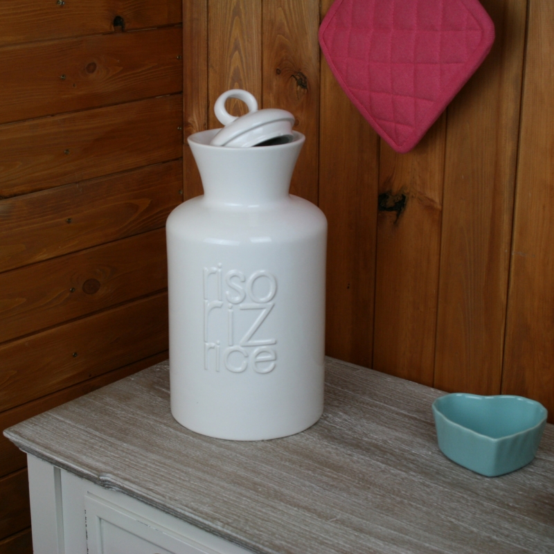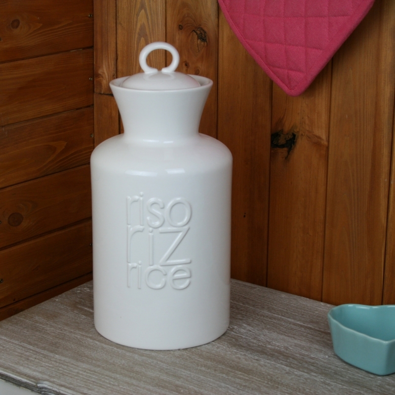 Dóza je vyrobená z veľmi kvalitnej keramiky s bielou lesklou glazúrou a nápisom riso / riz / rice. Na prvý pohľad je teda všetkým jasné, čo sa vo vnútri skrýva.