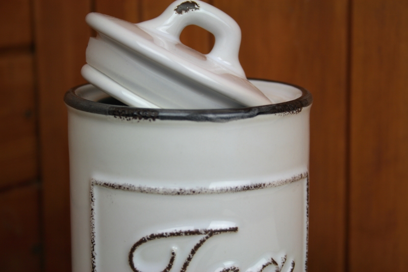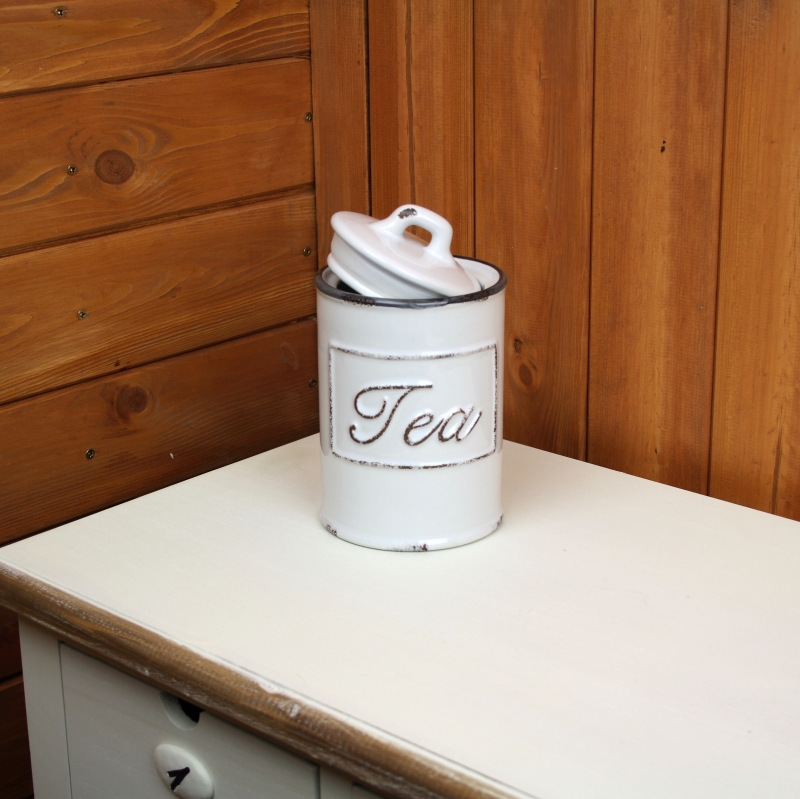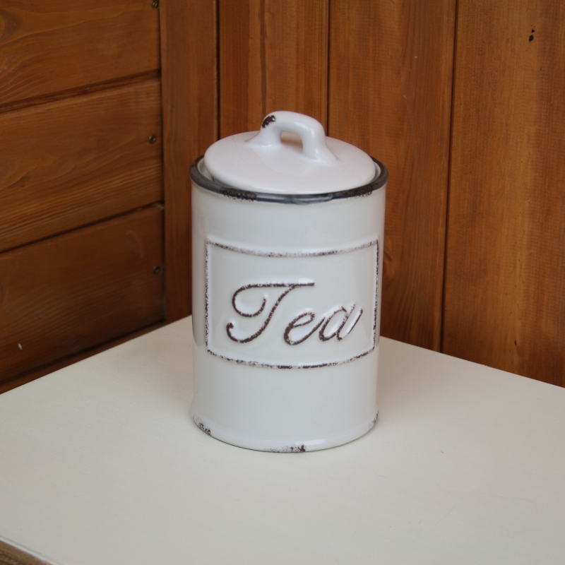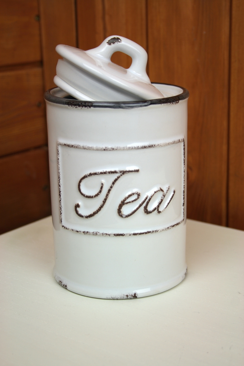 Dóza je keramická s otlčeným vzhľadom - imitácia smaltu. Prednú stranu dózy zdobí nápis Tea. Vďaka tomu na prvý pohľad každý spozná, čo sa v nej skrýva.