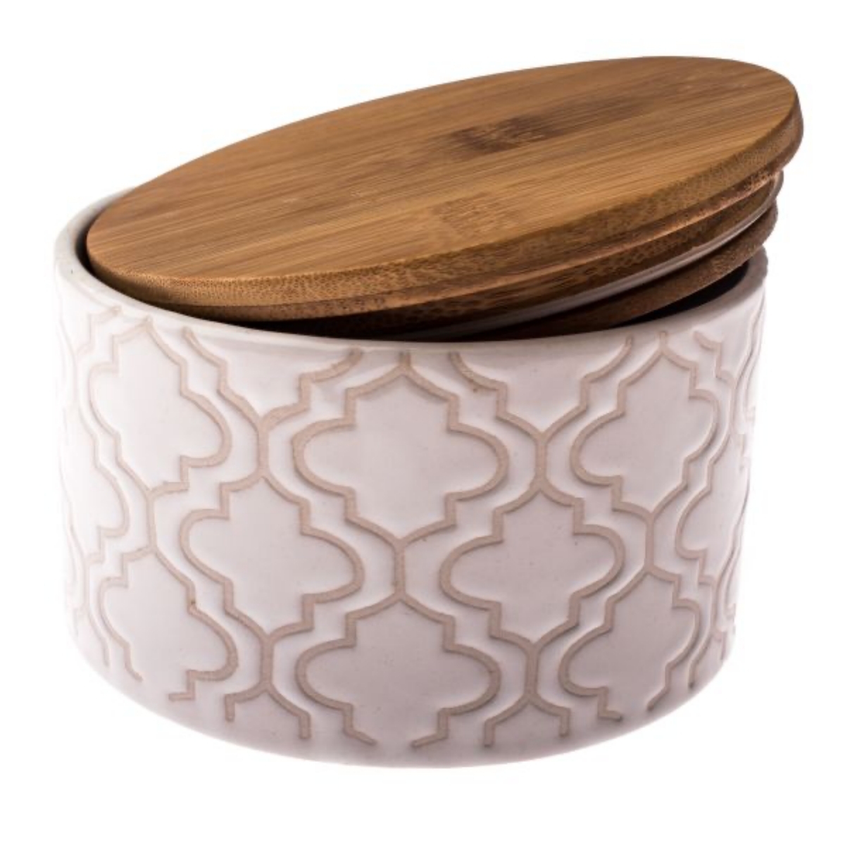 Praktická, menšia dóza s viečkom, vhodná napríklad na kávu, sypaný čaj, kakao, sušienky a podobné. Ochráni svoj obsah nielen pred škodcami. Je vyrobená z keramiky, takže je vhodná na styk s potravinami. Má bielu glazúru a jej povrch je zaujímavo ornamentálne zdobený.