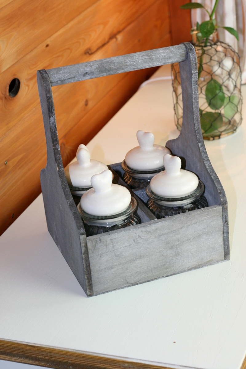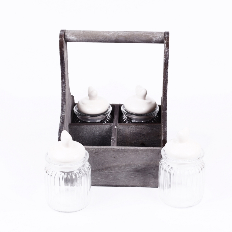 dózičky na potraviny v prepravke 19x19cm využijete napríklad na obľúbená korenie pri varení. Drevená prepravka s patinou je veľmi pekná sama o sebe, sklenené dózičky s motívom srdca na viečku jej však dodávajú ten pravý vidiecky nádych.