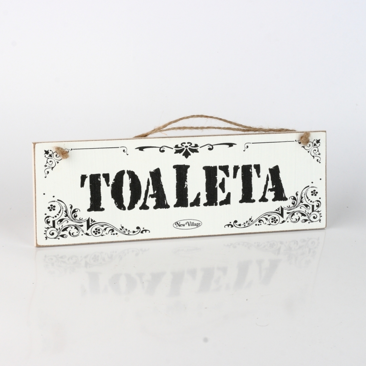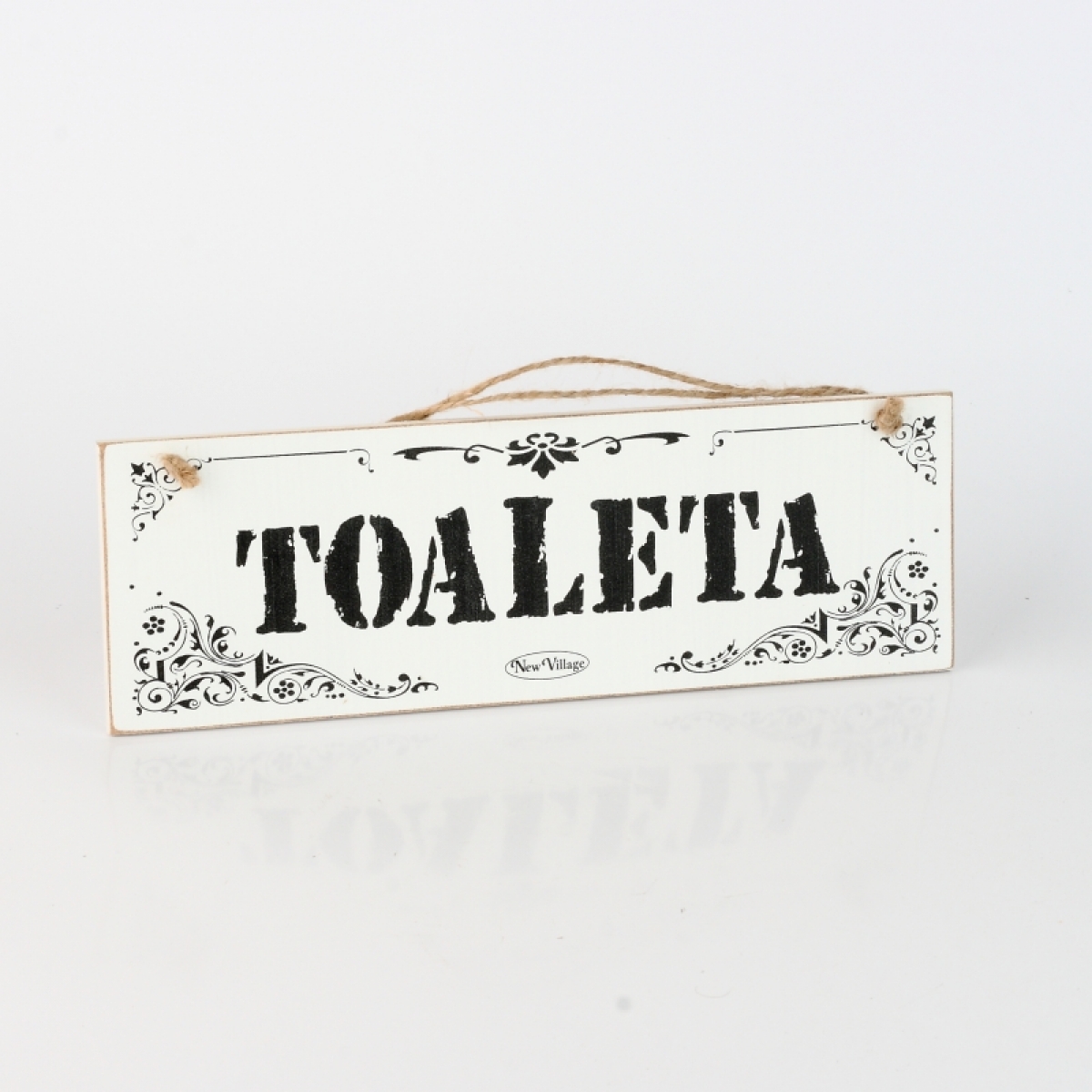 Drevená ceduľa je zdobená čiernym nápisom a ornamenty. K zavesenie slúži jutový povrázok.