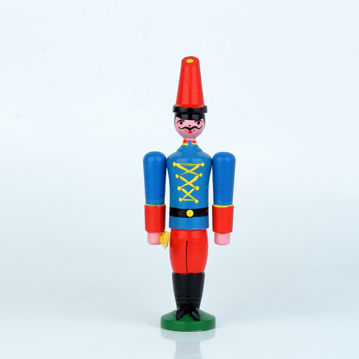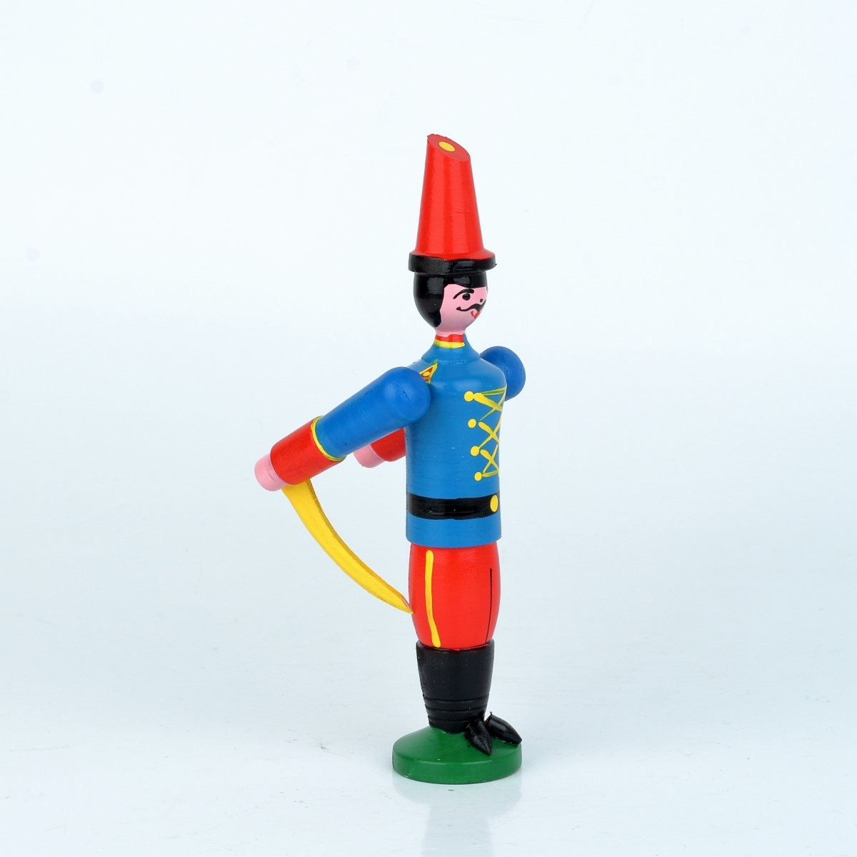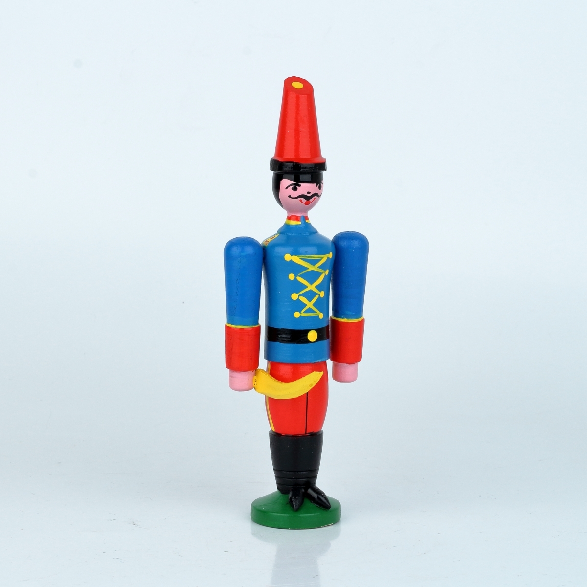 Husár je vysústružený z dreva a má pohyblivé ruky v smere hore-dole. V pravej zviera vojenskú šabľu. Má na sebe namaľovanú uniformu vo výraznej modro-červeno-žltej farebnej kombinácii. Táto drevená figúrka je ručne maľovaná a vyrobený v Českej republike.