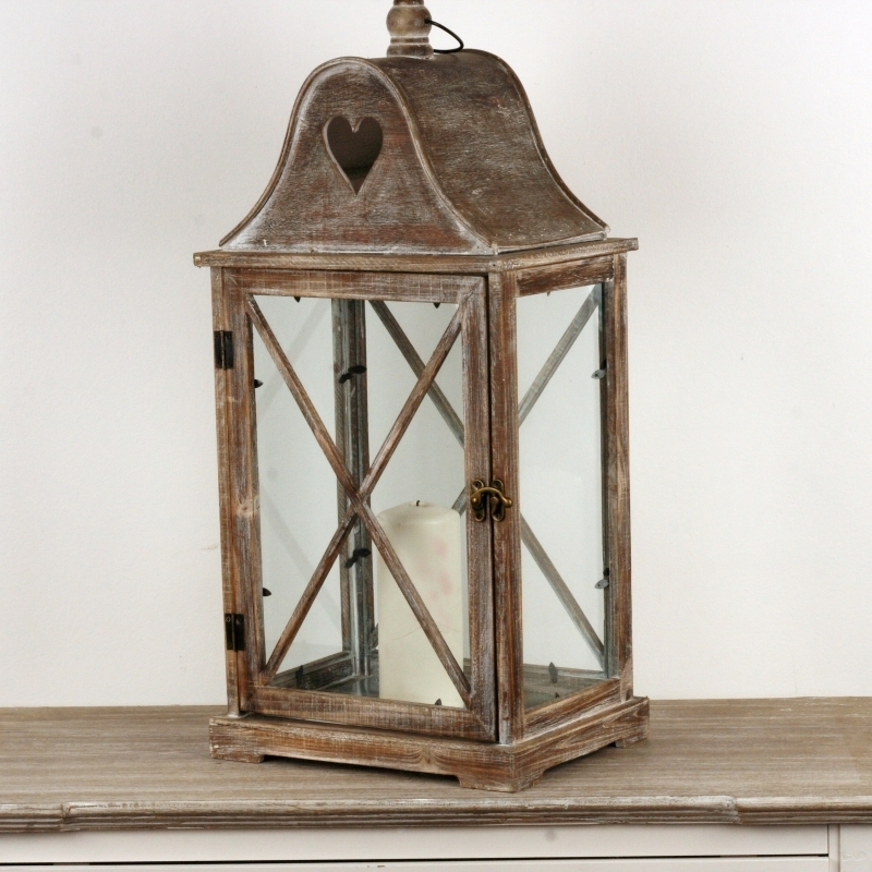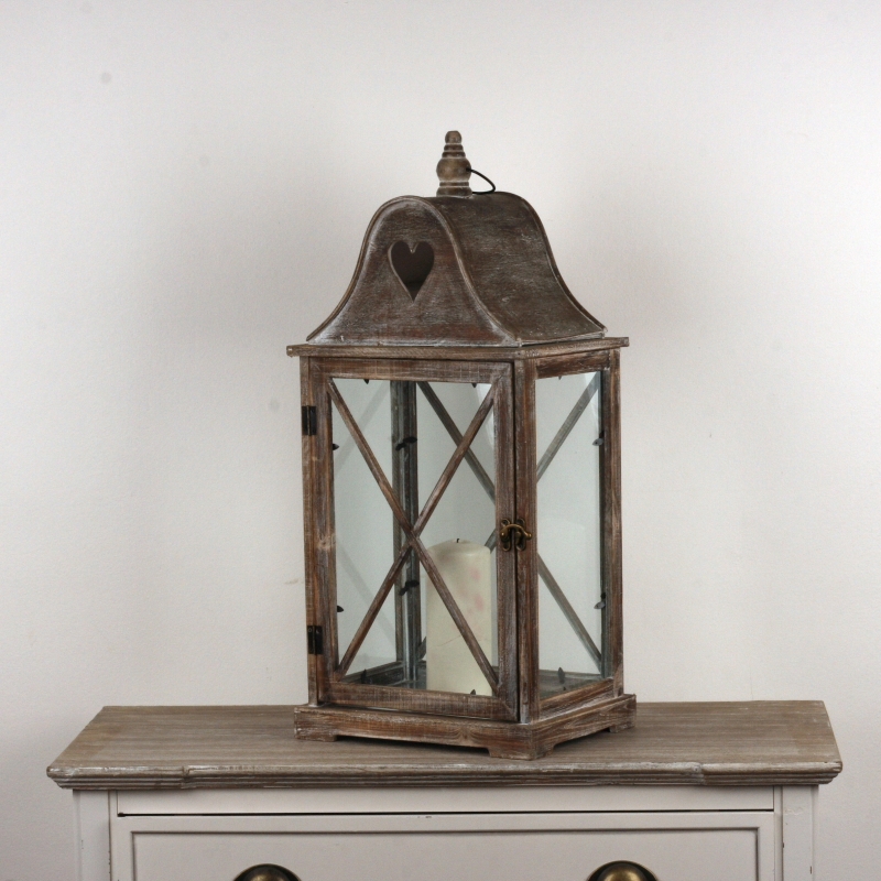 Vysoká drevená lucerna s patinou má presklená dvierka a vo strieške výrez v tvare srdca.