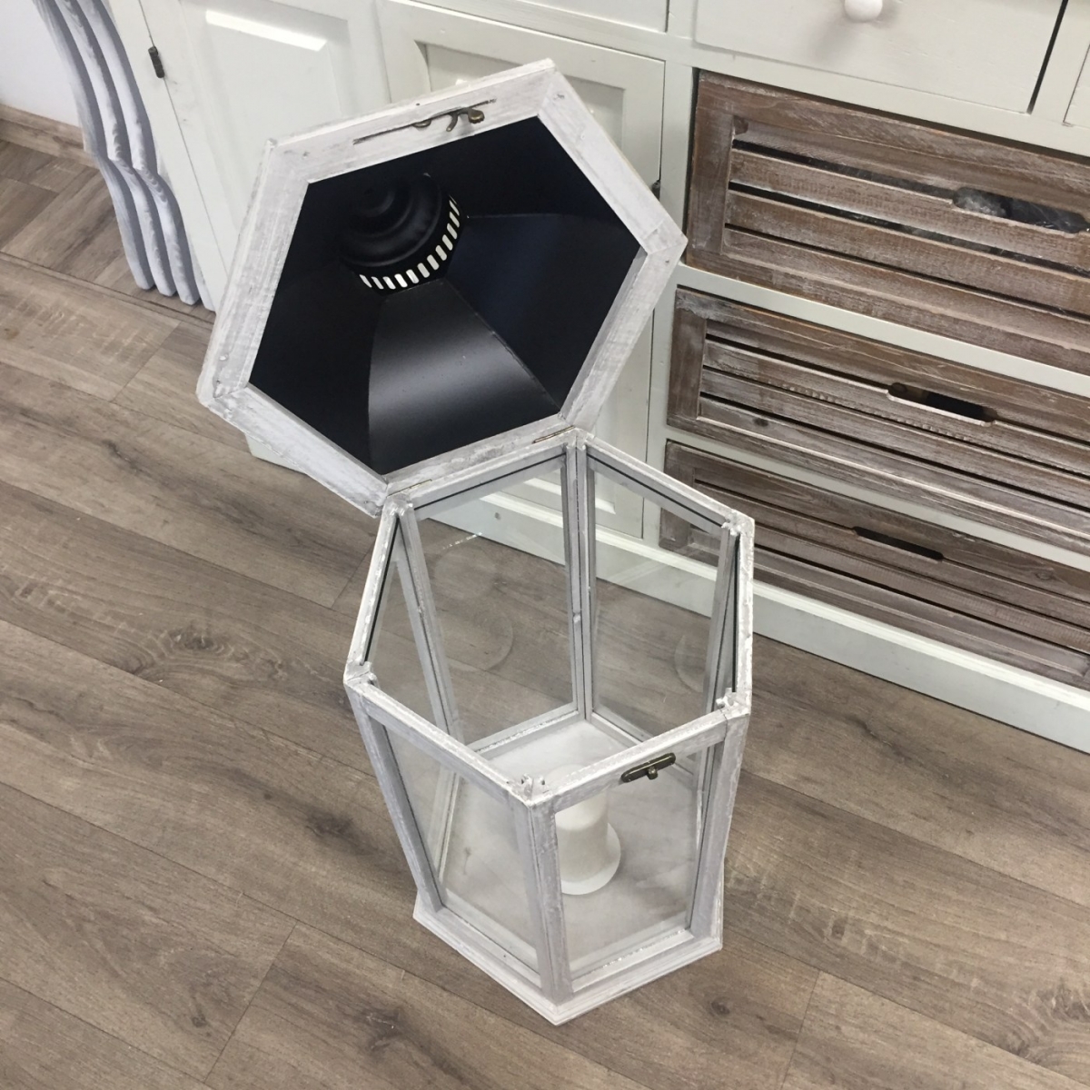 Drevená lampáš veľká má šesťhranný pôdorys a všetky jeho bočné steny sú presklené. Hornú časť lucerny tvorí kovová strieška, kopulovitého tvaru, ktorá zaisťuje vetranie a zároveň má na svojom vrchole očko, ktoré slúži na jej zavesenie.