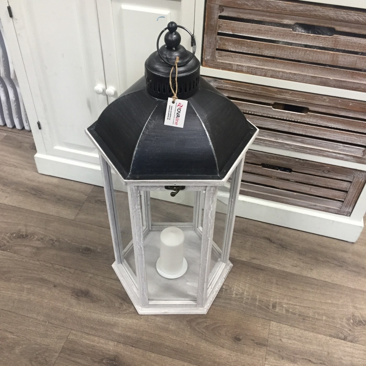 Sviečku je možné do drevené lucerny veľké vložiť, vďaka odklopnej strieške, ktorá je zaistená malou západkou. Drevené časti sú natreté svetlo šedou farbou a strieška má farbu tmavo šedú. Vnútri je opatrená kovovou doštičkou, ktorá chráni drevo pred vysokými teplotami horenia.