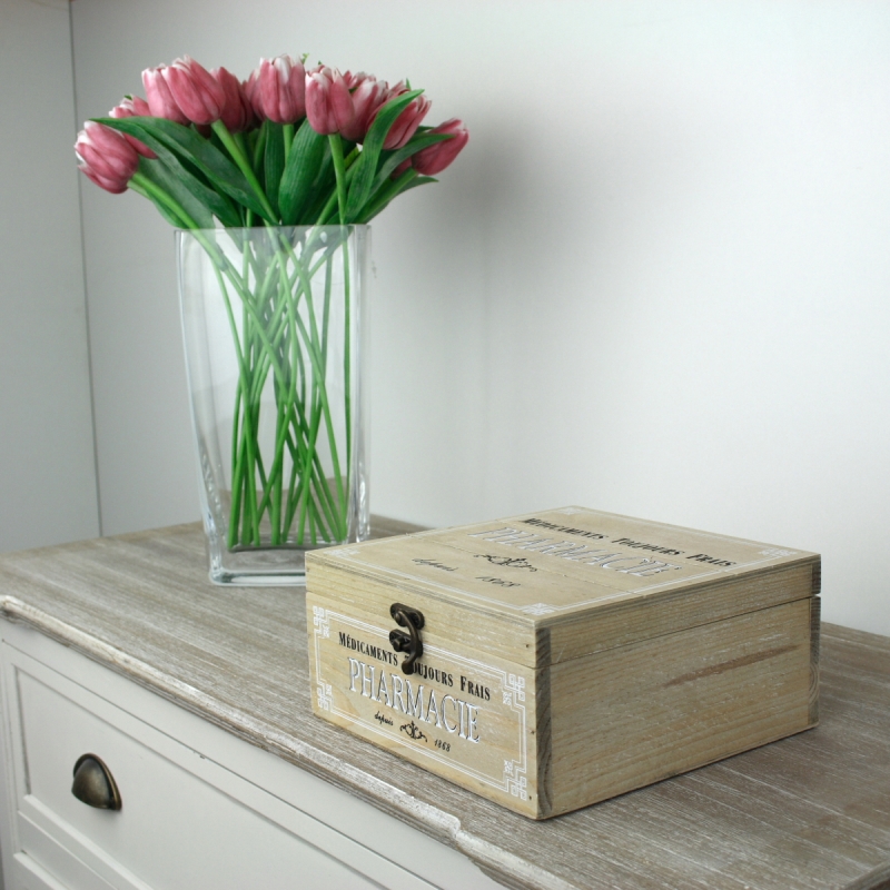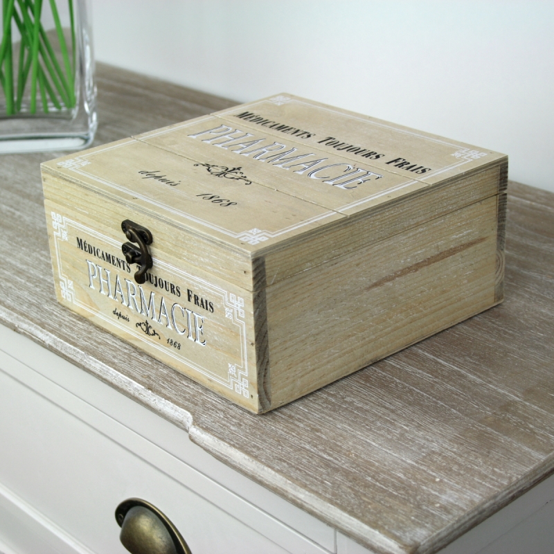 Drevená lekárnička Pharmacie na všetky bežné lieky, ktoré máte doma v zásobe. Lieky by mali byť skladované pohromade a predovšetkým v bezpečnej vzdialenosti od detí. To v tejto škatuľke nebude problém. Môže byť krásnou vintage dekoráciou na tej najhornejšia polici v kúpeľni.