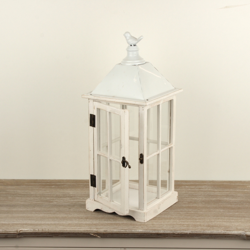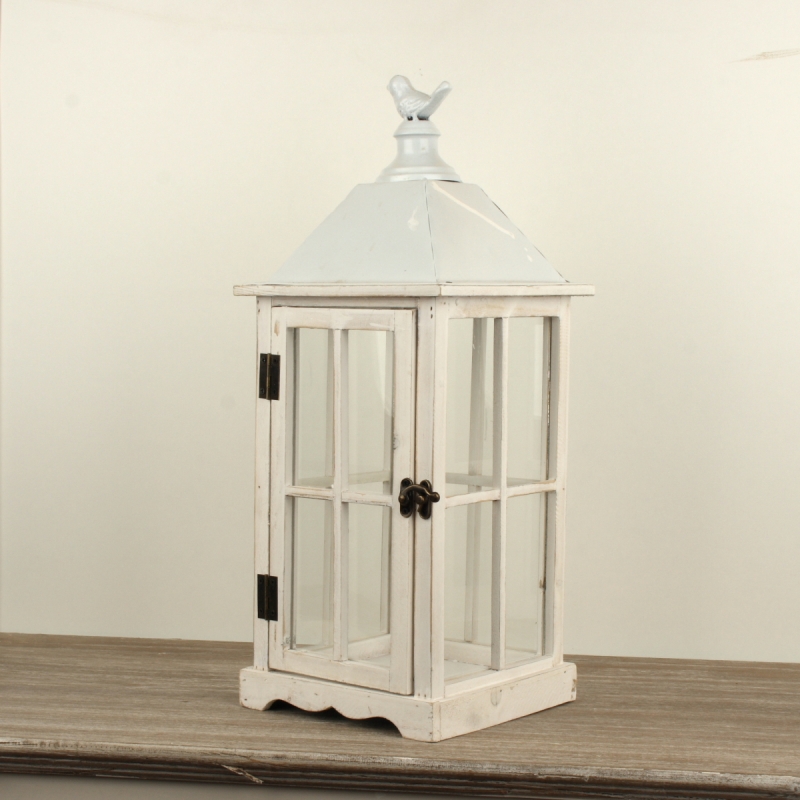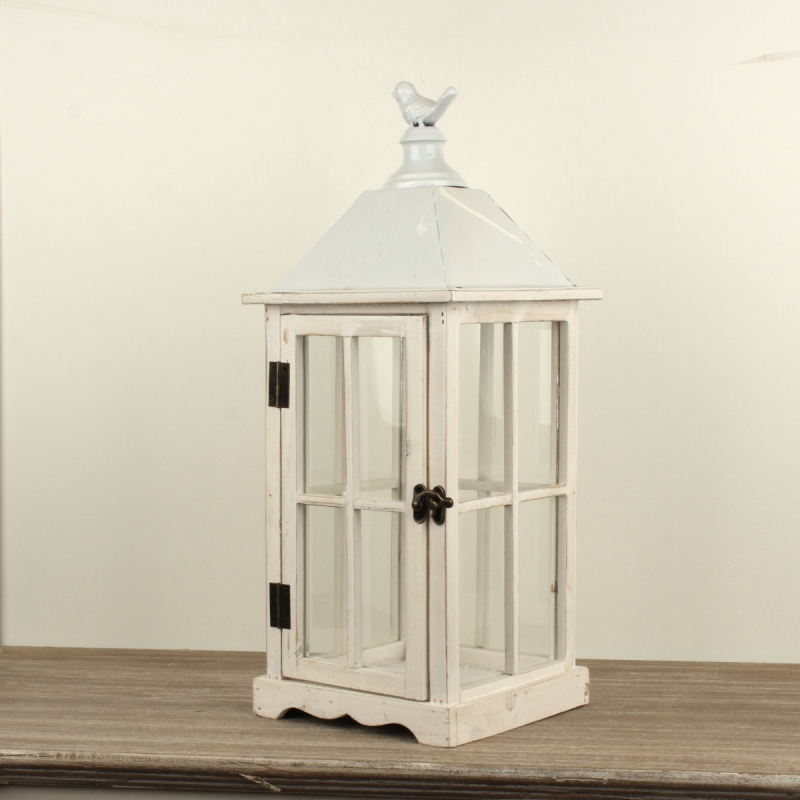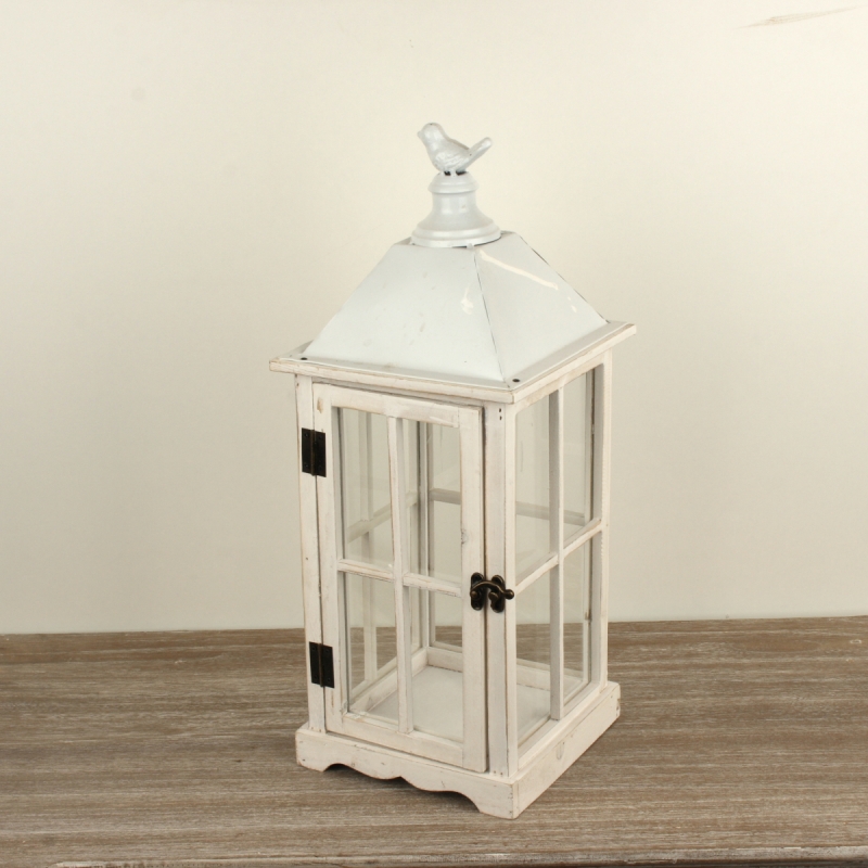 Táto lampáš je z dreva v bielej farbe, s kovovou strieškou, sklenenými oknami a vtáčikom na streche. Sviečku do nej jednoducho vložíte dvierkami na západku.