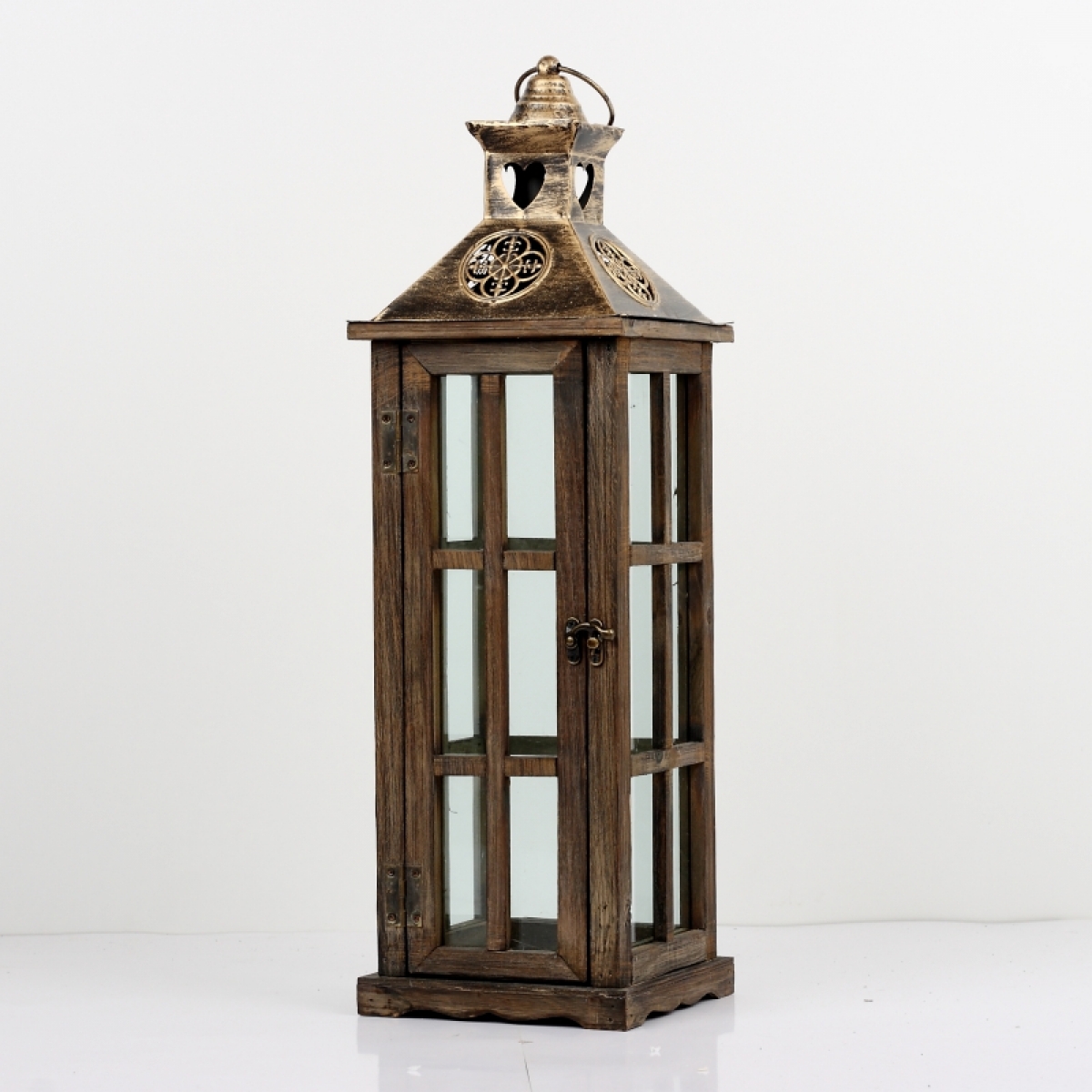 Drevená lucerna má presklené dvierka a kovovou triesky.