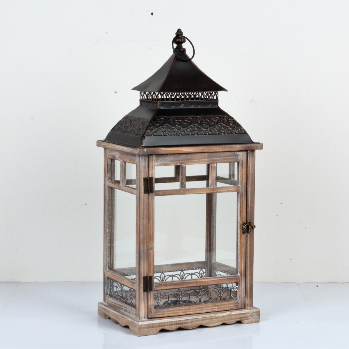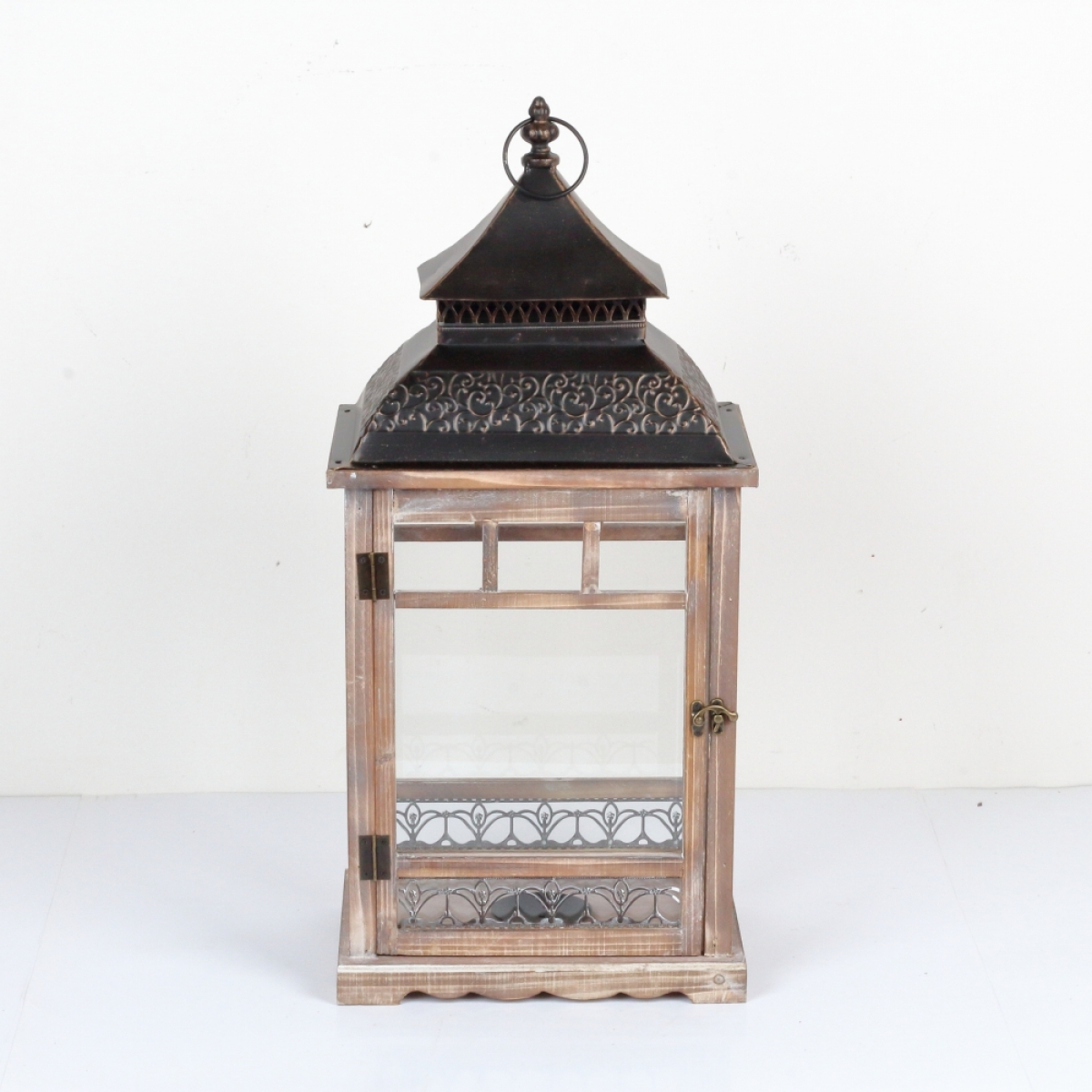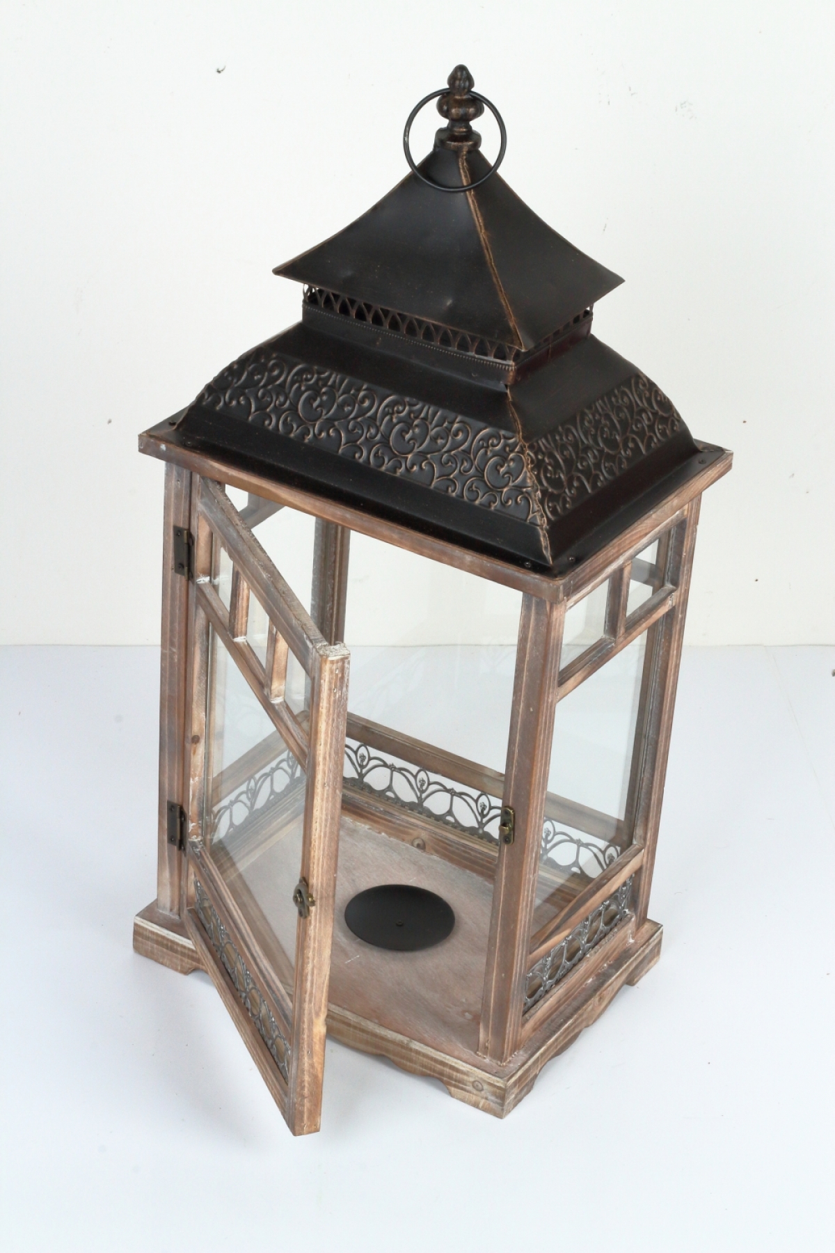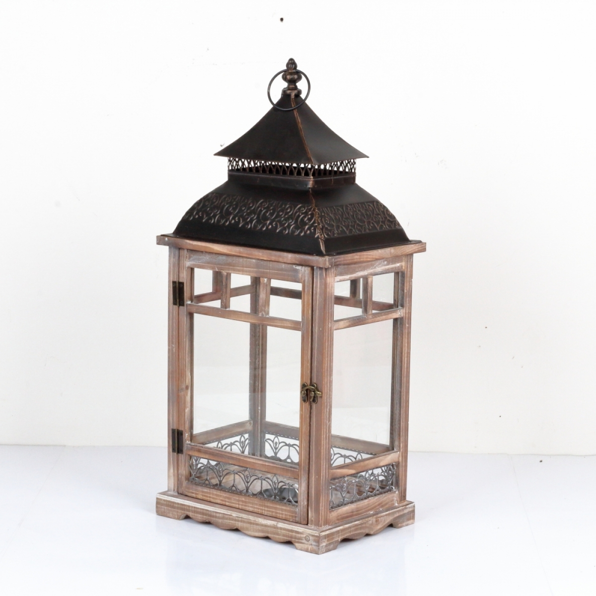 Drevená lucerna tmavo hnedá s kovovou strieškou 66cm